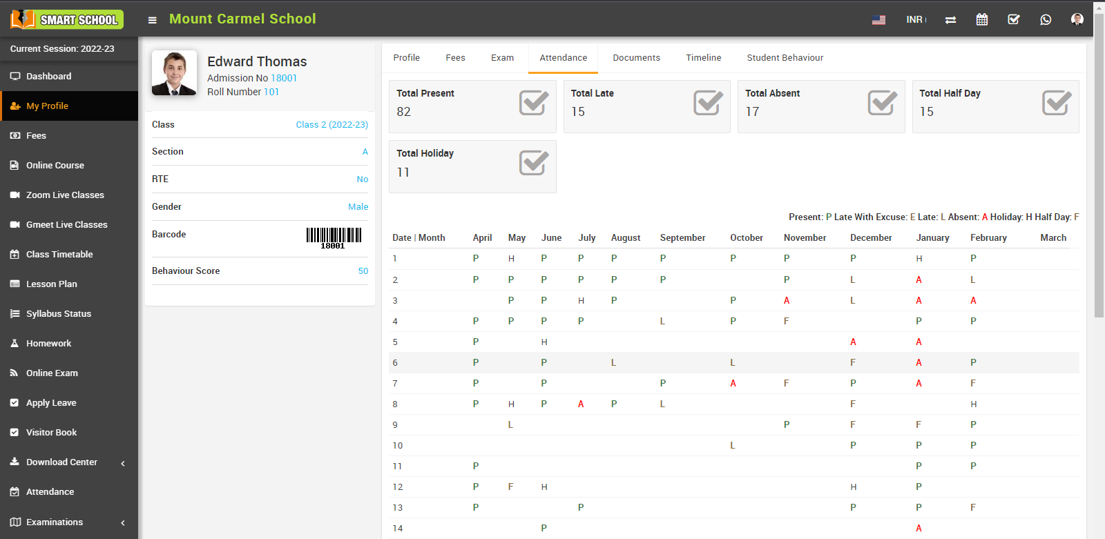 To check session attendance, go to Student Login > My Profile > Attendance. The attendance details for that student will be displayed here. The student can view his total session attendance by Total Present, Total Late, Total Absent, Total Half Day, Total Holiday and the student can also see the list of yearly session attendance with the date and months. You can also see the abbreviation of "attendance type as." P is for present, A is for absent, H is for holiday, E is late with an excuse, and F is for half day.