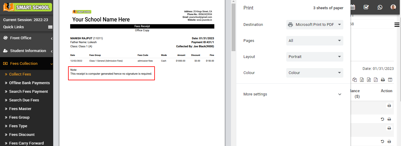 In the receipt, you can see the all details related to fees as well as you can also see the one note that says, "This receipt is computer generated, hence no signature is required