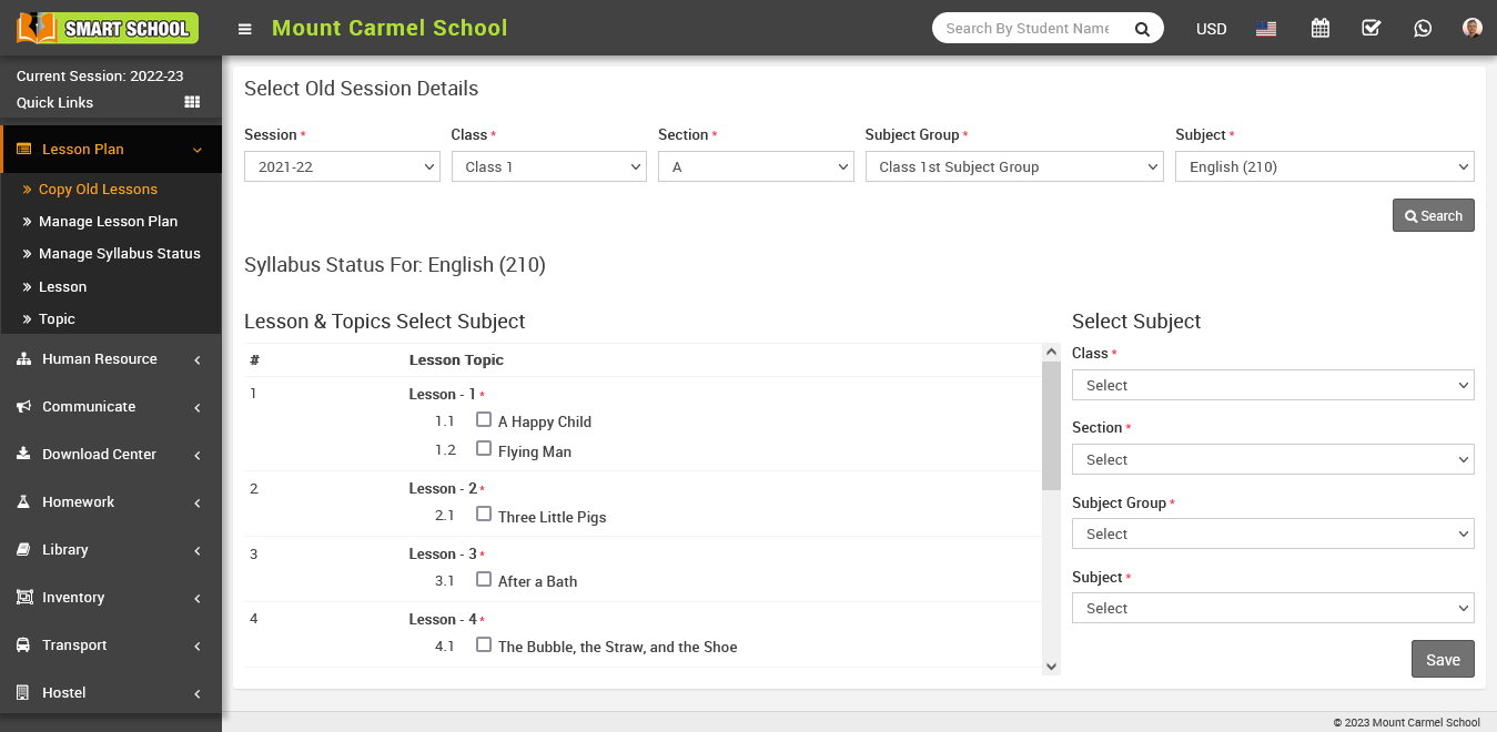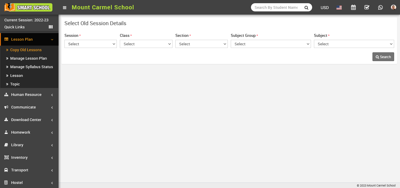 To add Copy Old Lessons go to Lesson Plan > Copy Old Lessons then Select the preferred Session, Class, Section, Subject Group, Subject and click on Search button.
