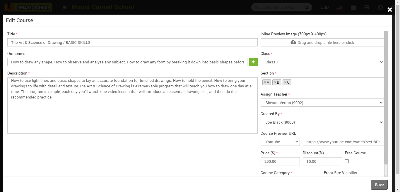 then click on the + Add Course button the enter Title, Outcomes, Description, Inline Preview Image, Class, Section, Assign Teacher, Course Preview URL, Price, Discount, Free Course (if you want to upload course free of cost) Course Category, Front Site Visibilty ( you can manage the front side visibility of online course if you select the Yes, the online course, which you added, will be show in front side of smart school, and if you select No, online course will not be visible in front side of smart school ) then finally click on the Save button present at the top right corner.