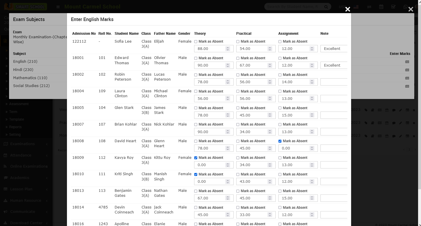 In this model, you can view multiple students for a particular subject along with their Admission Number, Roll Number, Father's Name, and Gender. You can also see the Theory and Practical columns with corresponding input fields. Simply enter the marks based on the students' performance along with any notes you want to include regarding their performance. If a student was absent during the relevant exam, simply check the Mark As Absent checkbox located above the input field and finally click on the save button and marks will be save for that subject successfully. Please follow the same process to enter the marks for all subjects for the student.