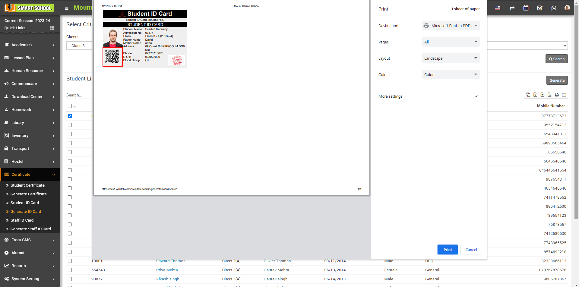 Student ID card will be generated successfully and on this student ID card you can also see the QRcode, which is showing in below.