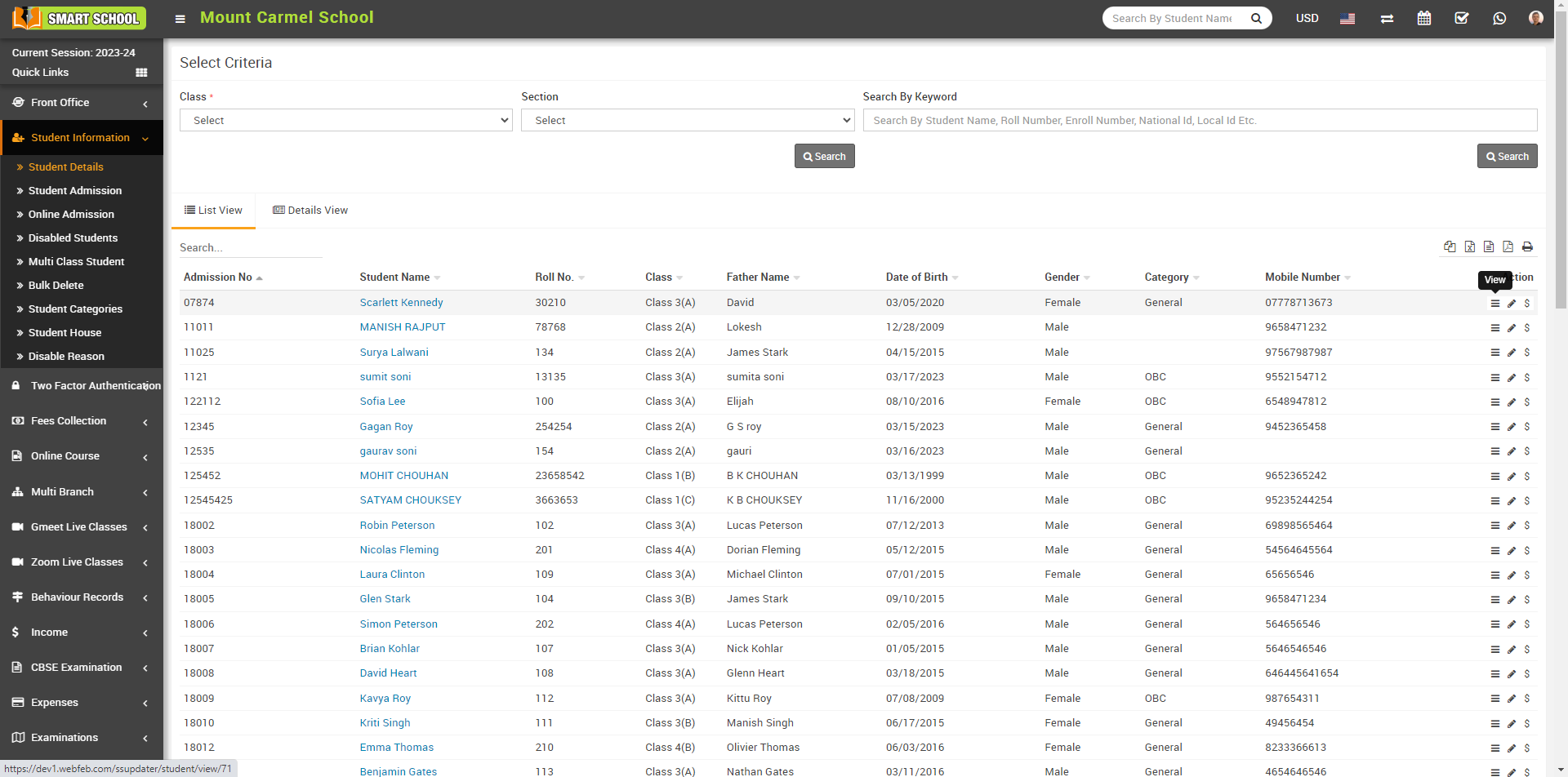 Student list will be open in below, now open the student profile, by click on View icon or student name.