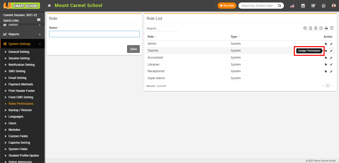To assign permission click on Assign Permission icon present in role list, at click of this icon Assign Permission page will be open, Here you can assign permission for each module and then click on Save button.