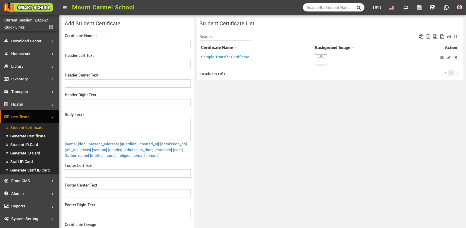 To edit student certificate, click on Edit icon and to delete student certificate, click on Delete icon present in Action column in student certificate list.