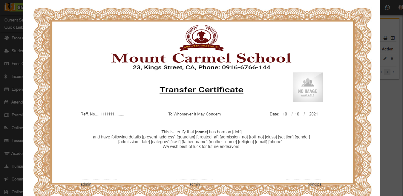 To preview student certificate, click on View icon present in Action column, at click of this icon Certificate will be open.