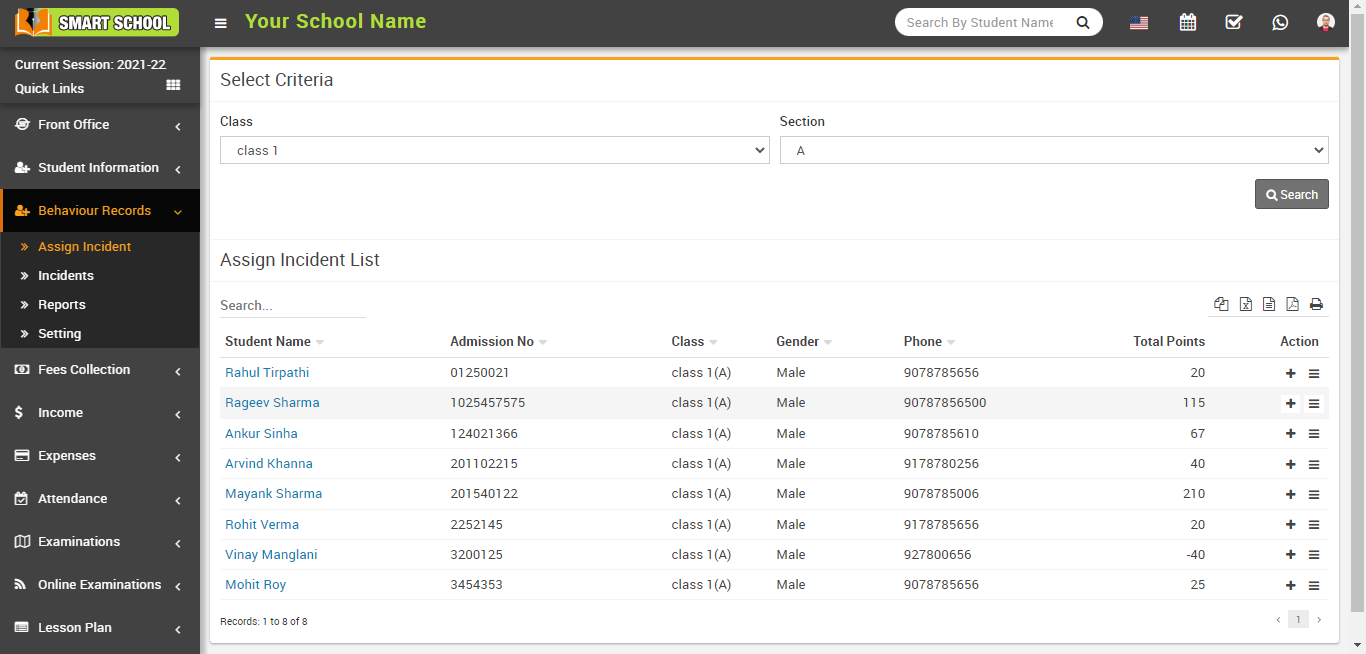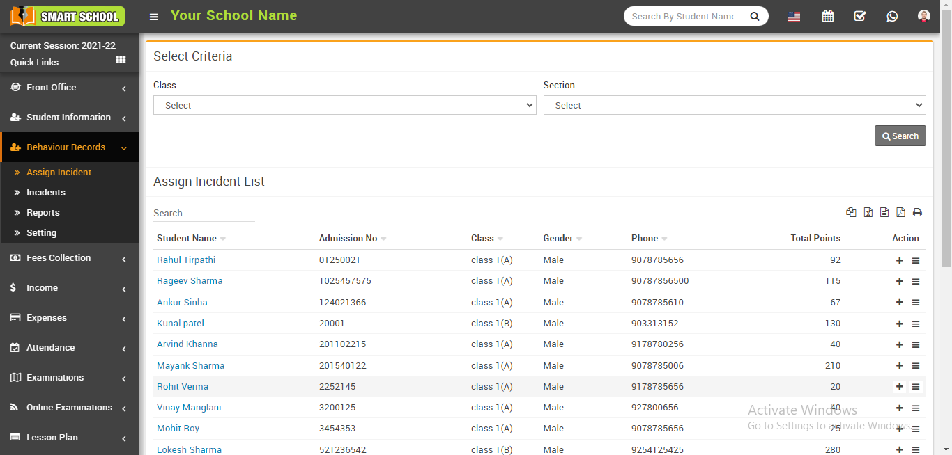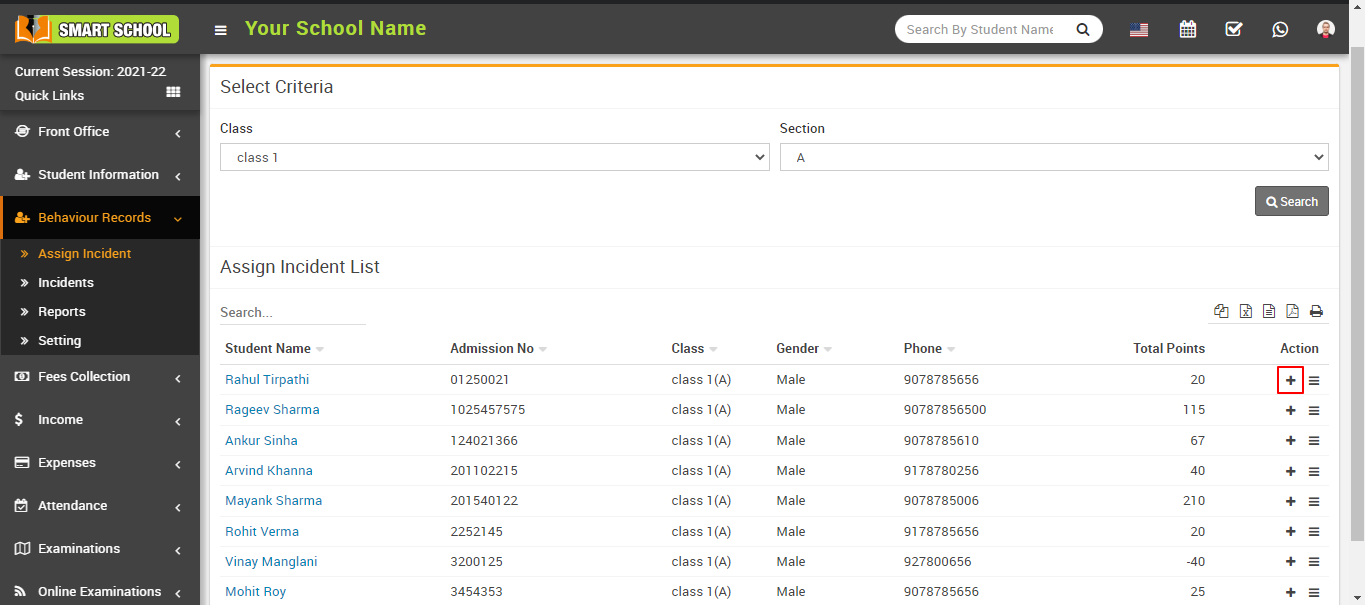 The assign incident list has seven columns: the first column contains the student name list that you searched using the above criteria; the second column contains the student admission number; the third column contains the student's class and section; the fourth and fifth columns contain the student's gender and phone number; and the sixth column contains the student's positive and negative total points.