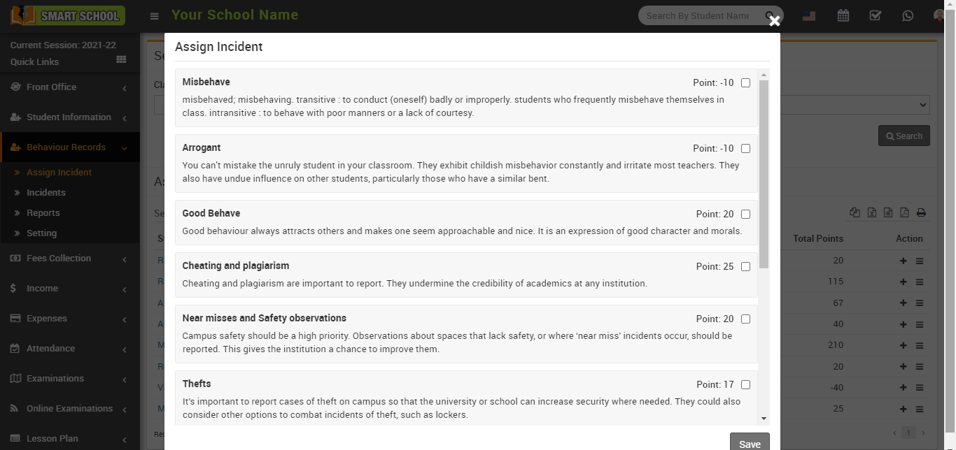 On the assign incident page, you can see the various types of incidents that are displayed, whether positive or negative. Now on this page, you can also see incident points and a checkbox on the right side of the page. Now, when assigning the incident to the student, please check the check box. You can also check the multiple checkbox of assign incidents to the student.