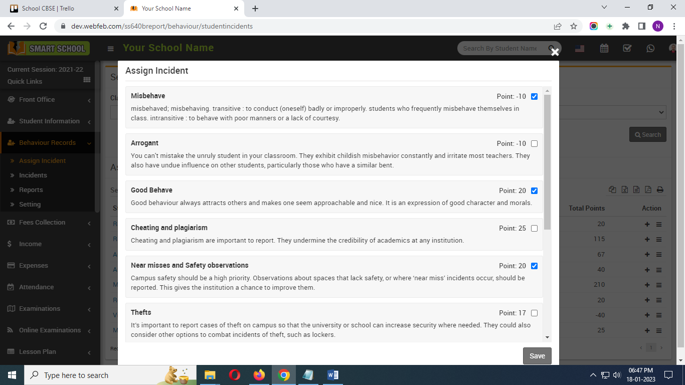 Now click on save button which showing in left bottom corner. By click on save button, incident and points are assign to the student.