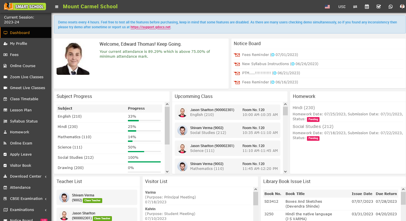 On the right side, you can see schedule for the upcoming exams that has been published by the Superadmin. In exam schedule, you can see the information about the exam such as number of subject of exam, exam dates, start times, durations, and room numbers.