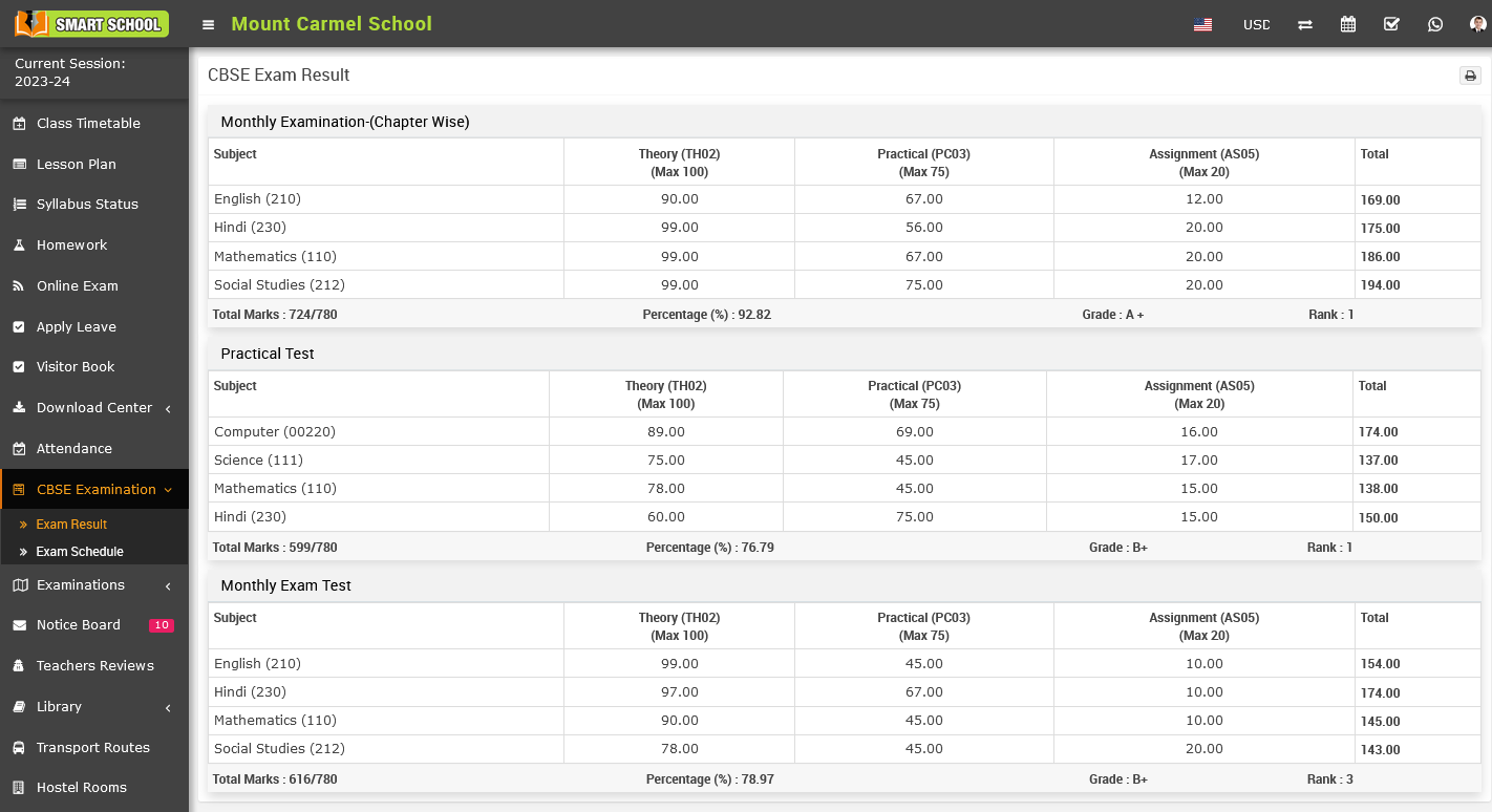 Now, click on 'Exam Result', and the CBSE Exam-wise results will open on the right side. On this page, you can view the exam-wise results that have been published by the Superadmin. The result displays subject-wise marks, as well as the total marks, percentage, grade, and rank for that exam.