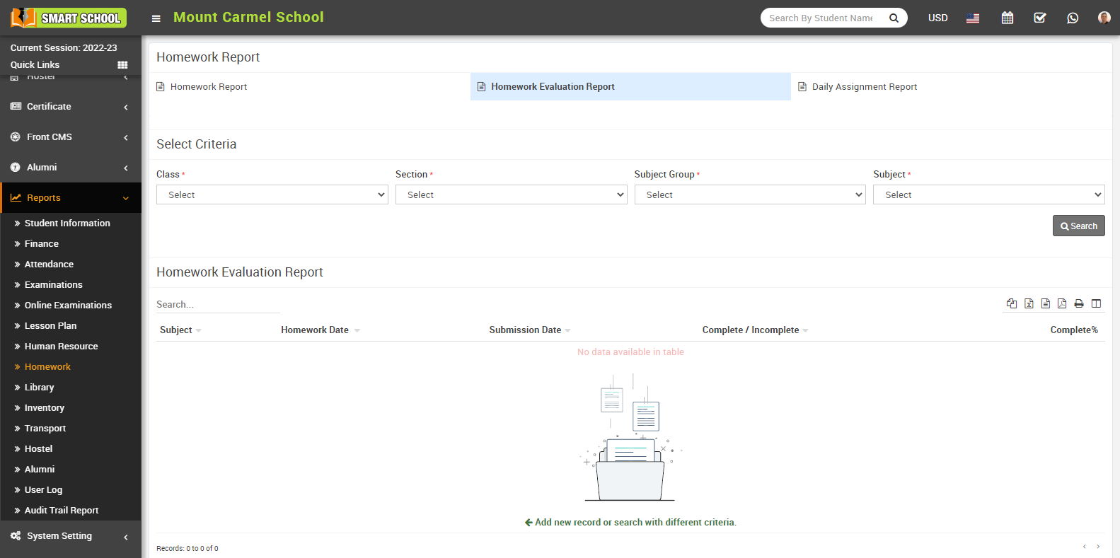 To check Homework Evaluation Report, go to Report > Homework, click on Homework Evaluation Report.
