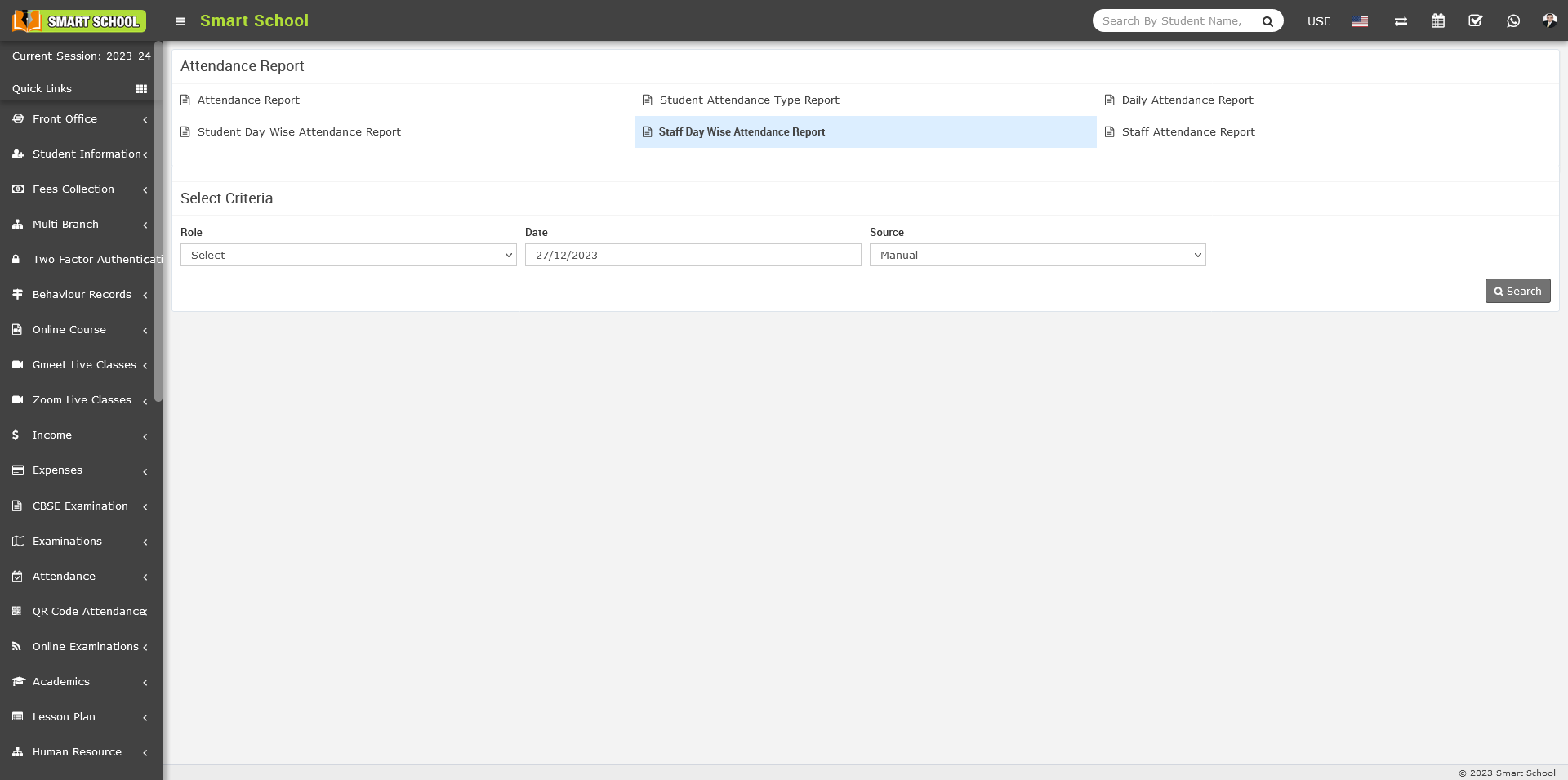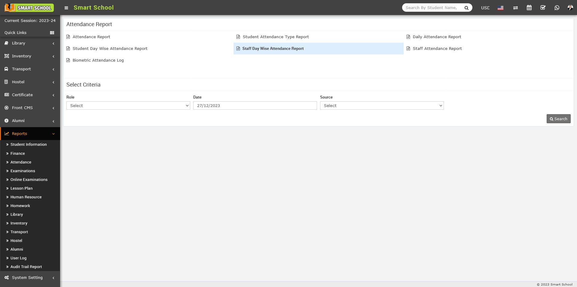 On the right side you can see the multiple attendance reports are showing and one of them staff day wise attendance report is available, simply click on Staff Day Wise Attendance Report, search criteria will be open in below.