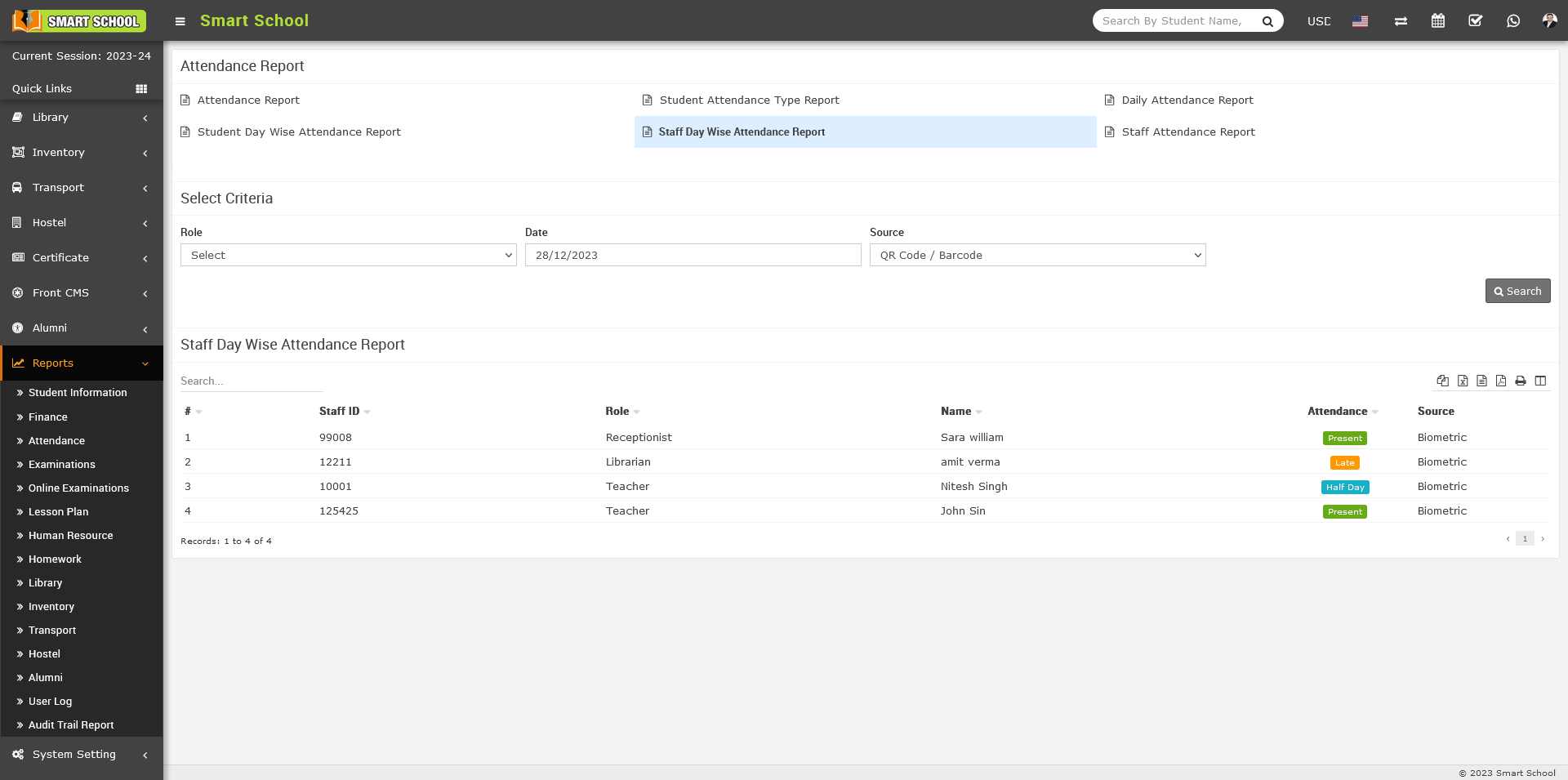 Note : - In QR Code / Barcode Attendance, Absent and Holiday as attendance status will not be show in the Attendance column on the staff day wise attendance report.