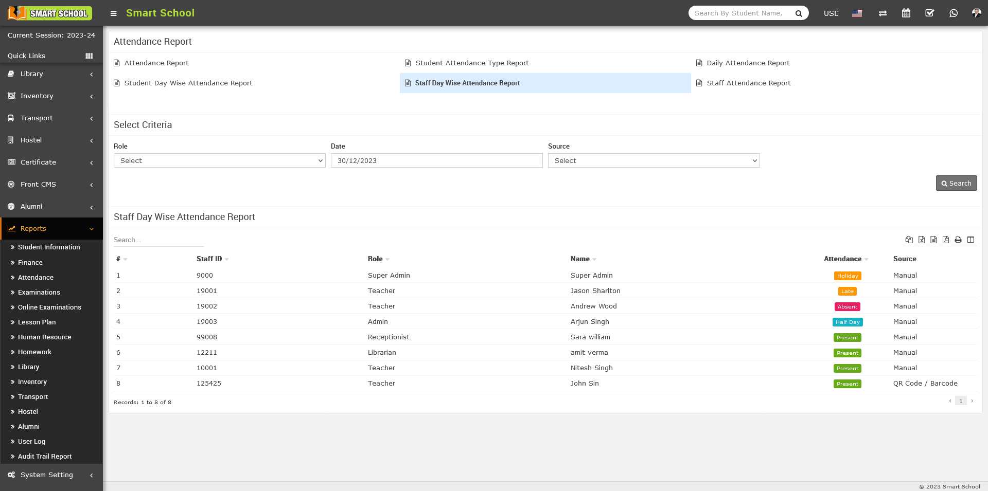 In this report, you can view the Staff ID, Role, Staff Name, Attendance Status, Date and IP Address, Agent, Source column, indicating the method used to attendance has been marked. In the Attendance column, you will see the attendance status, such as Present, Absent, Half Day, Late, or Holiday.