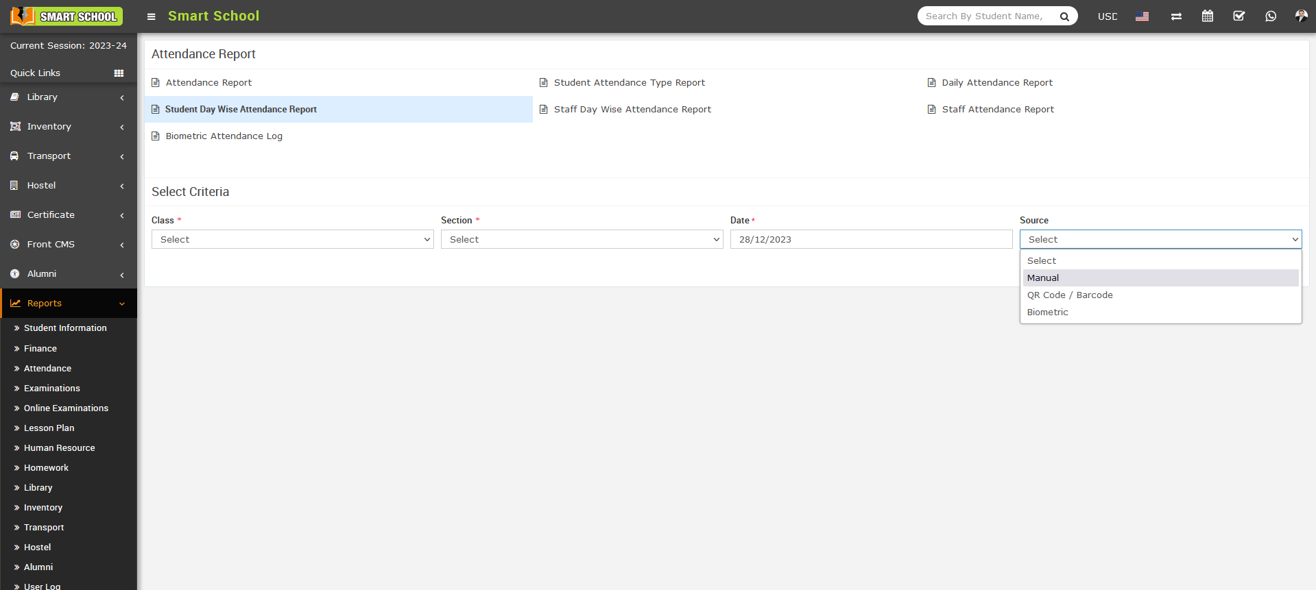 Here, you can see Class, Section, and Date, The last option is Source, where, upon clicking, attendance type options will be open as Manual, QR Code / Barcode, and Biometric.