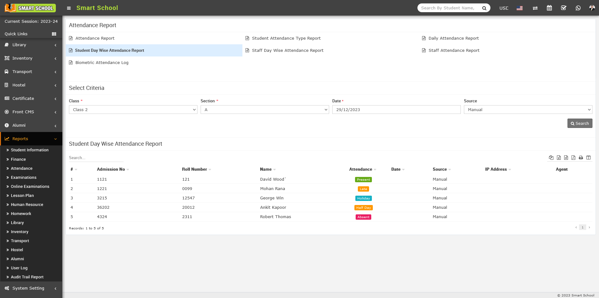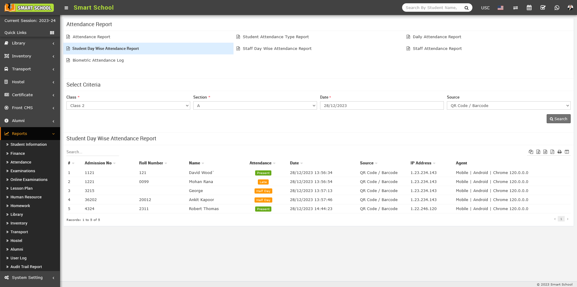In this report, you can view the Admission number, Roll Number, Student name, Attendance Status, Date and IP Address, Agent, Source column, In the Attendance column, you will see the attendance status, such as Present, Absent, Half Day, Late, and Holiday.