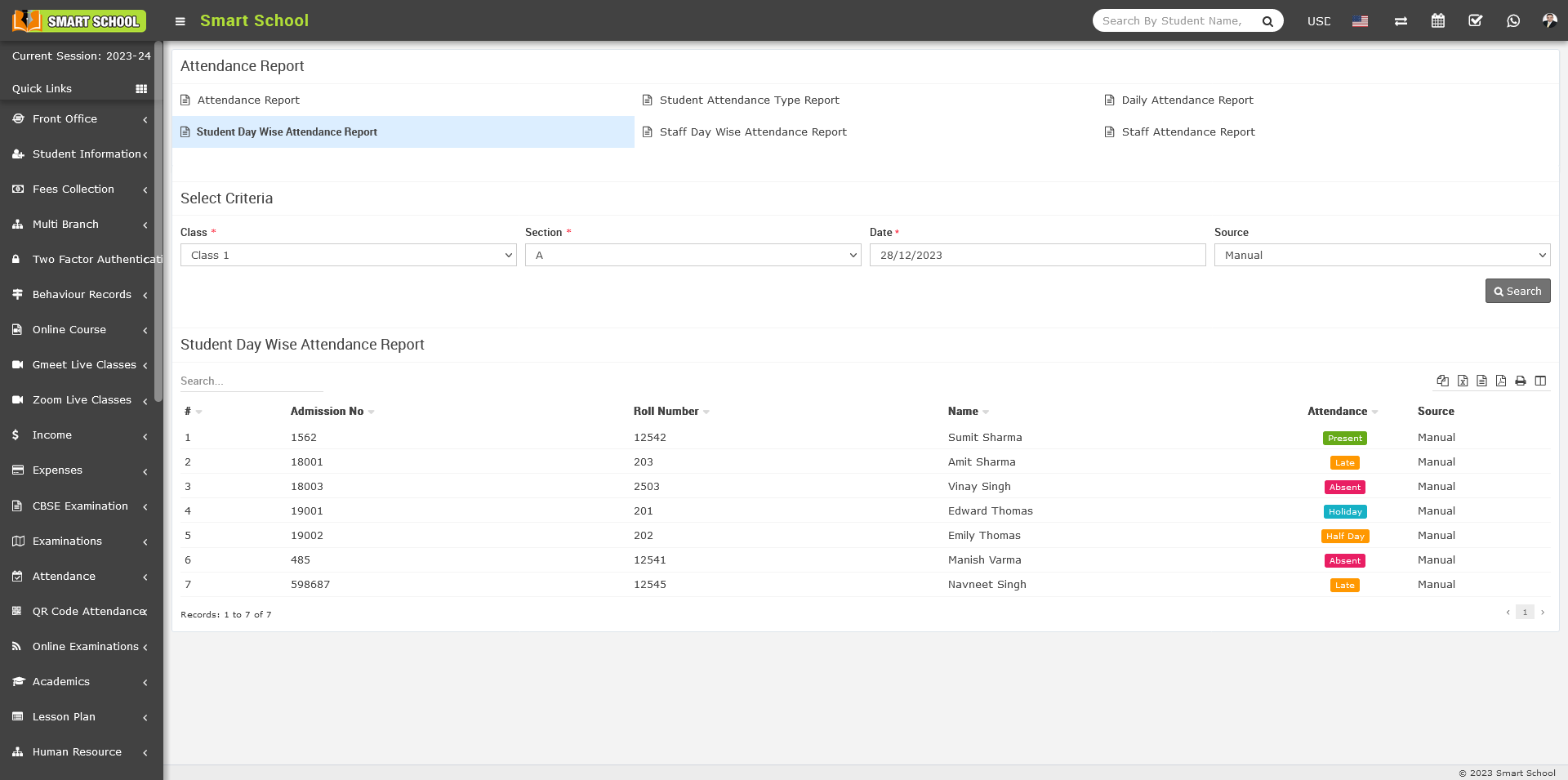 Here, you can view the Admission number, Roll Number, Student name, Attendance Status, Date, Source, IP Address and Agent details are display, source column indicating the method used to marked attendance. In the Attendance column, you will find the attendance status, such as present, half day, late.