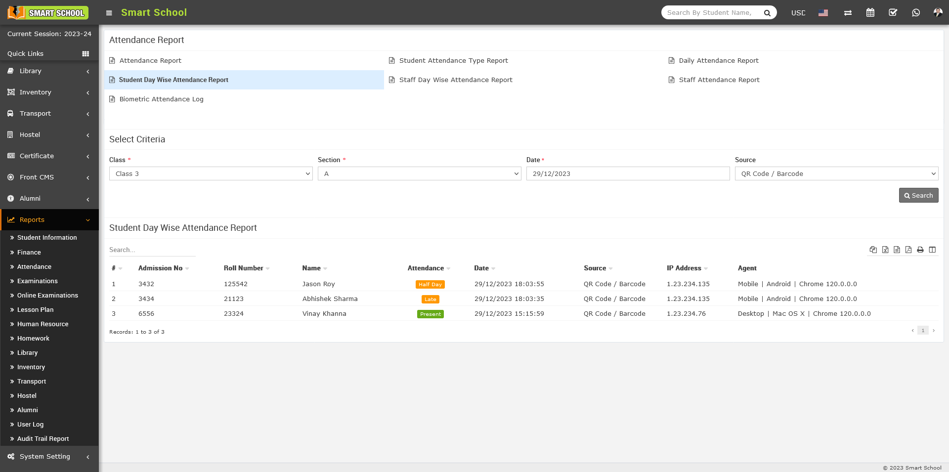 Here, you can view the Admission number, Roll Number, Student name, Attendance Status, Date, Source, IP Address and Agent details are display, In the Attendance column, and you will see the attendance status, such as Present, Half Day and Late.