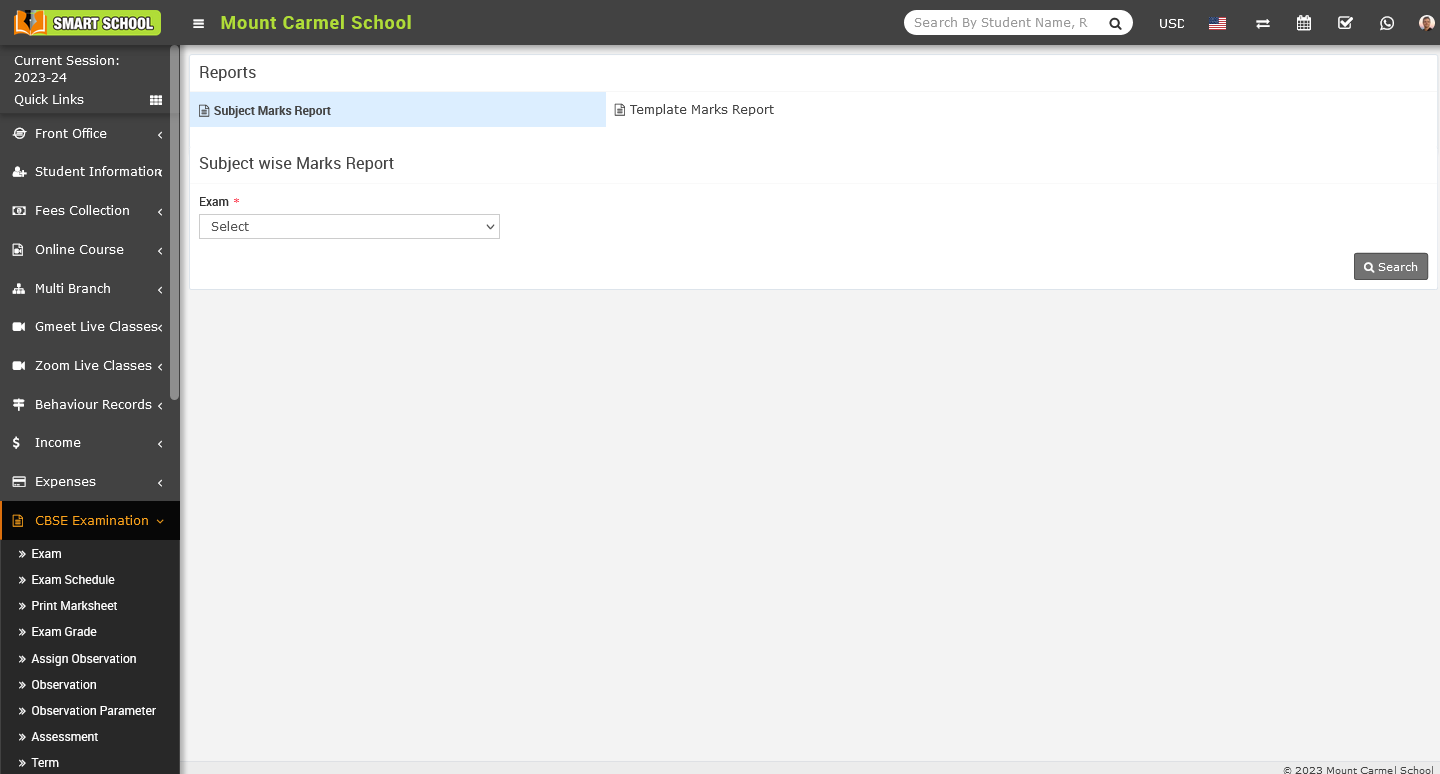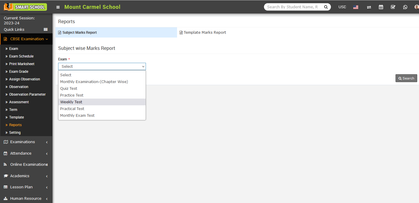On this page you can see Subject Marks Report available, simple click on Subject Marks Report and subject wise mark report field will be open in below.