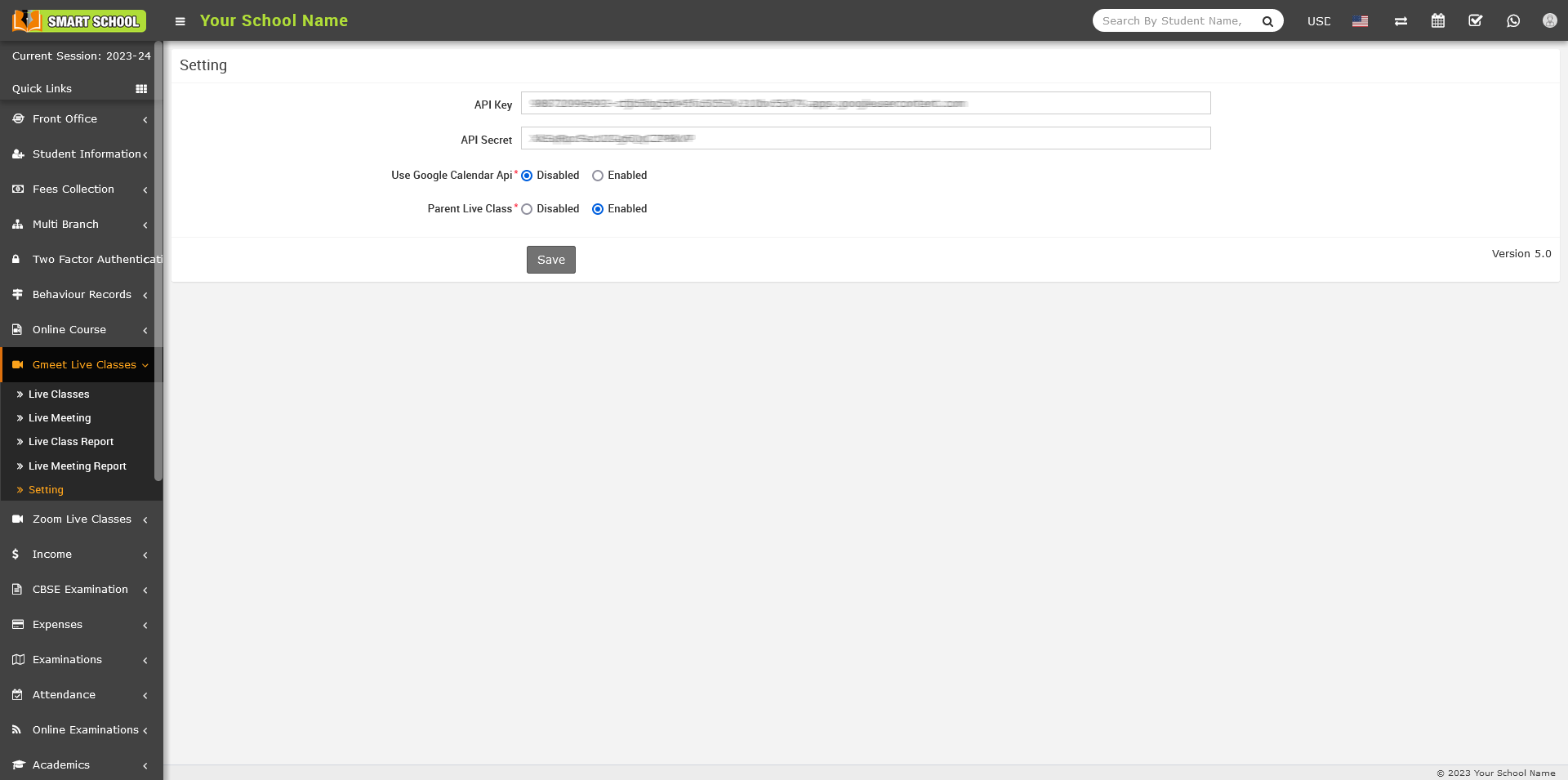 To configure Gmeet live Class, go to Gmeet Live Classes >> Setting, then enter API Key and API Secret (to get API Key and API Secret follow https://smart-school.in/article/how-to-get-gmeet-api-key-and-secret-key link) and select Use Google Calendar Api Enable/Disable (if you select this option Enabled then you need to sign in your Gmail account before adding Gmeet Live Classes or Meeting and if you check this option Disabled then you need to enter your Gmeet URL while creating Gmeet Live Classes or Meeting) and then click on the Save button.