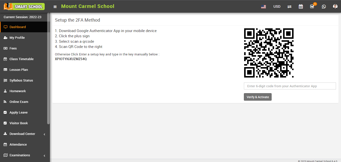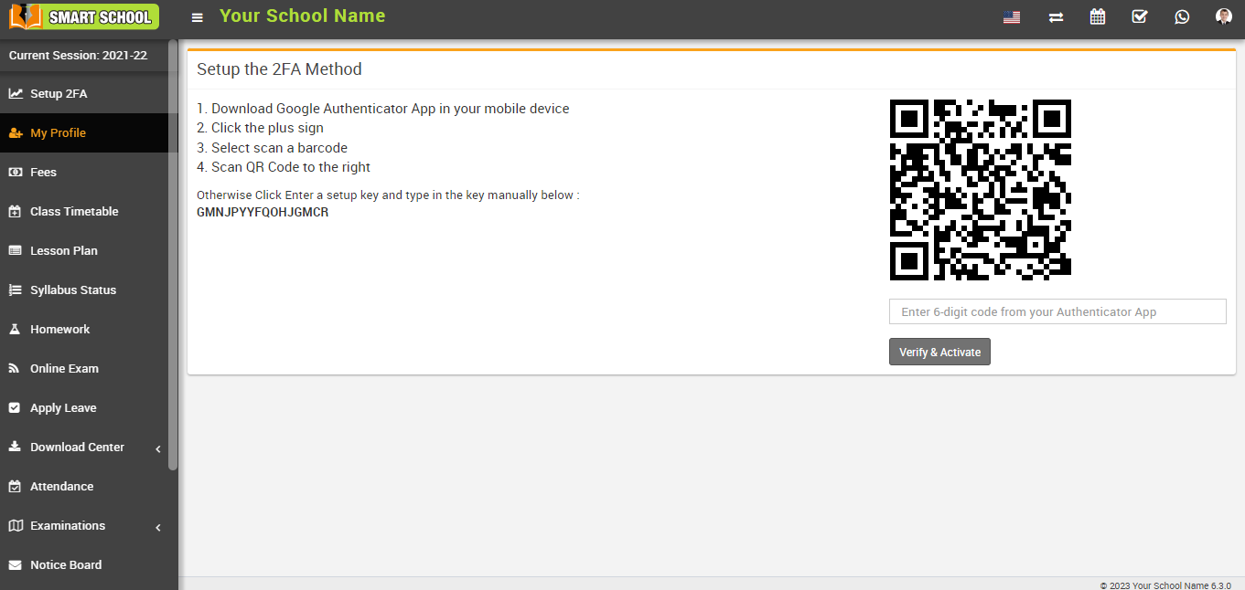 - After filling out the six-digit verification code, you have enabled the 2FA method in your Smart School.