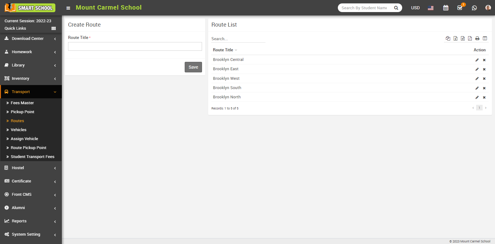 To create routes, go to Transport > Routes. Here you can create route by fill the name of route in route title and click on save button, your created route will be show in route list.