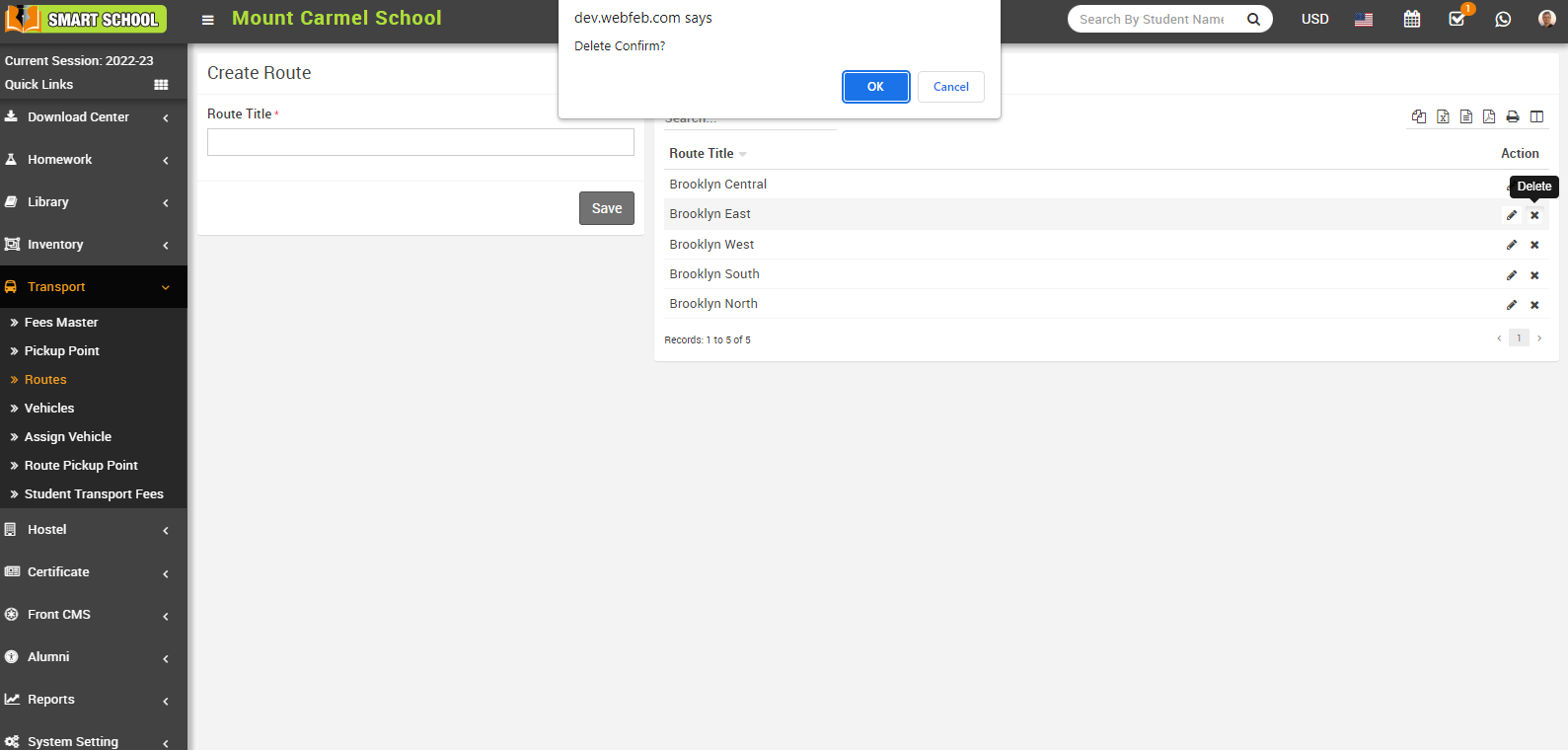 To delete the created route, simply click on the Delete icon in the Action column to delete a route, a confirmation model will appear.