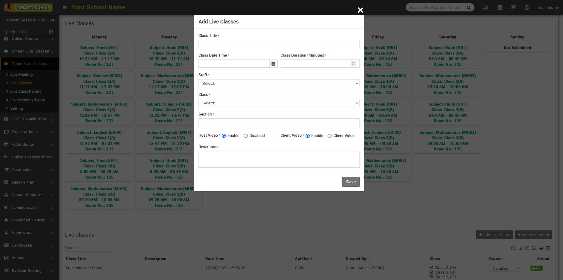 Here enter Class Title, Class Date, Class Duration (Minutes), Role, Staff (select teacher/staff who will take this class), Class, Section, Host Video, Client Video, Description details for live class then finally click on Save button.