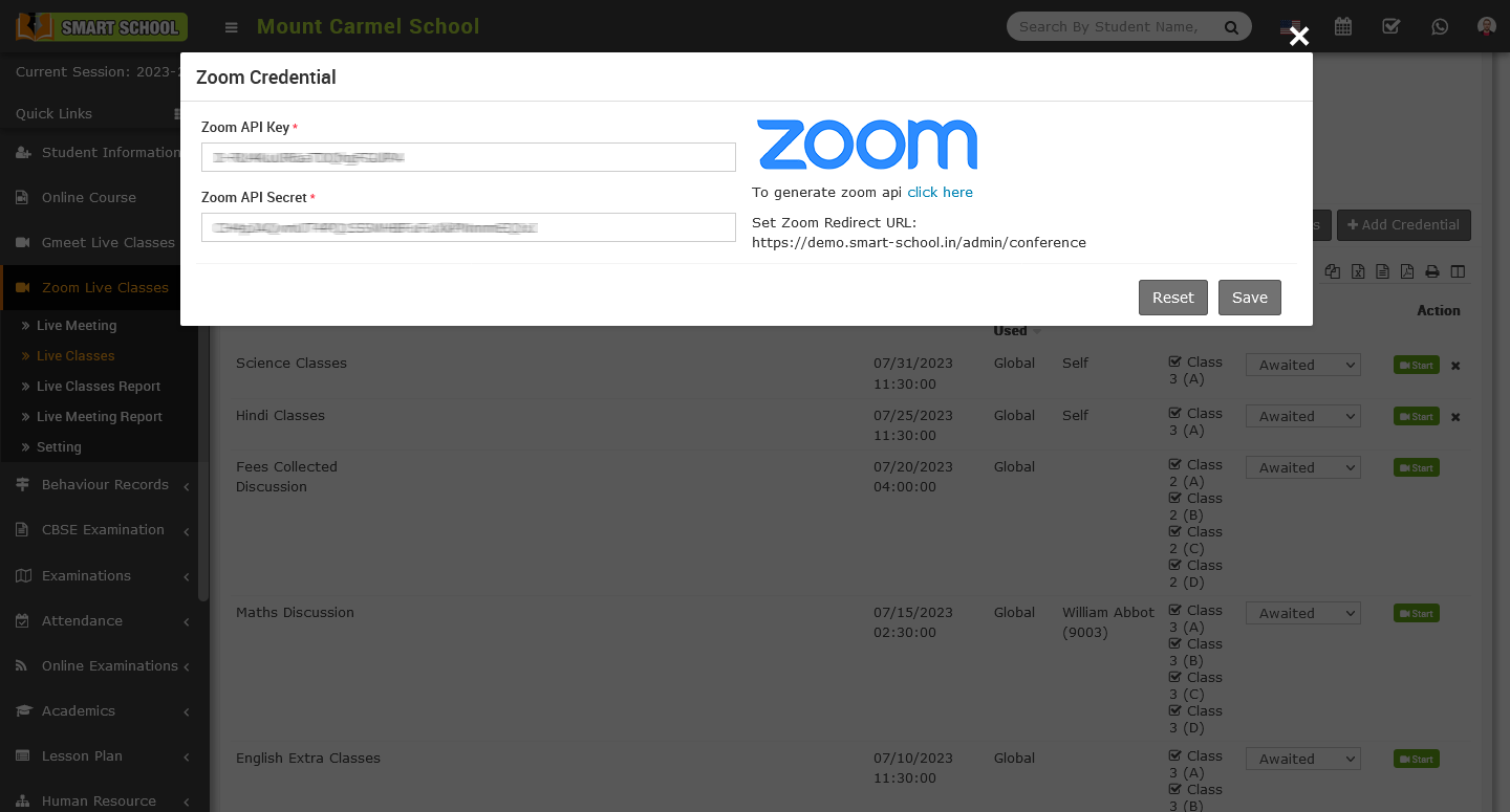 Teacher user can set their own zoom account api from Zoom Live Class > Live Classes > Add Credential, here enter Zoom API Key and Zoom API Secret details then click on Save button.