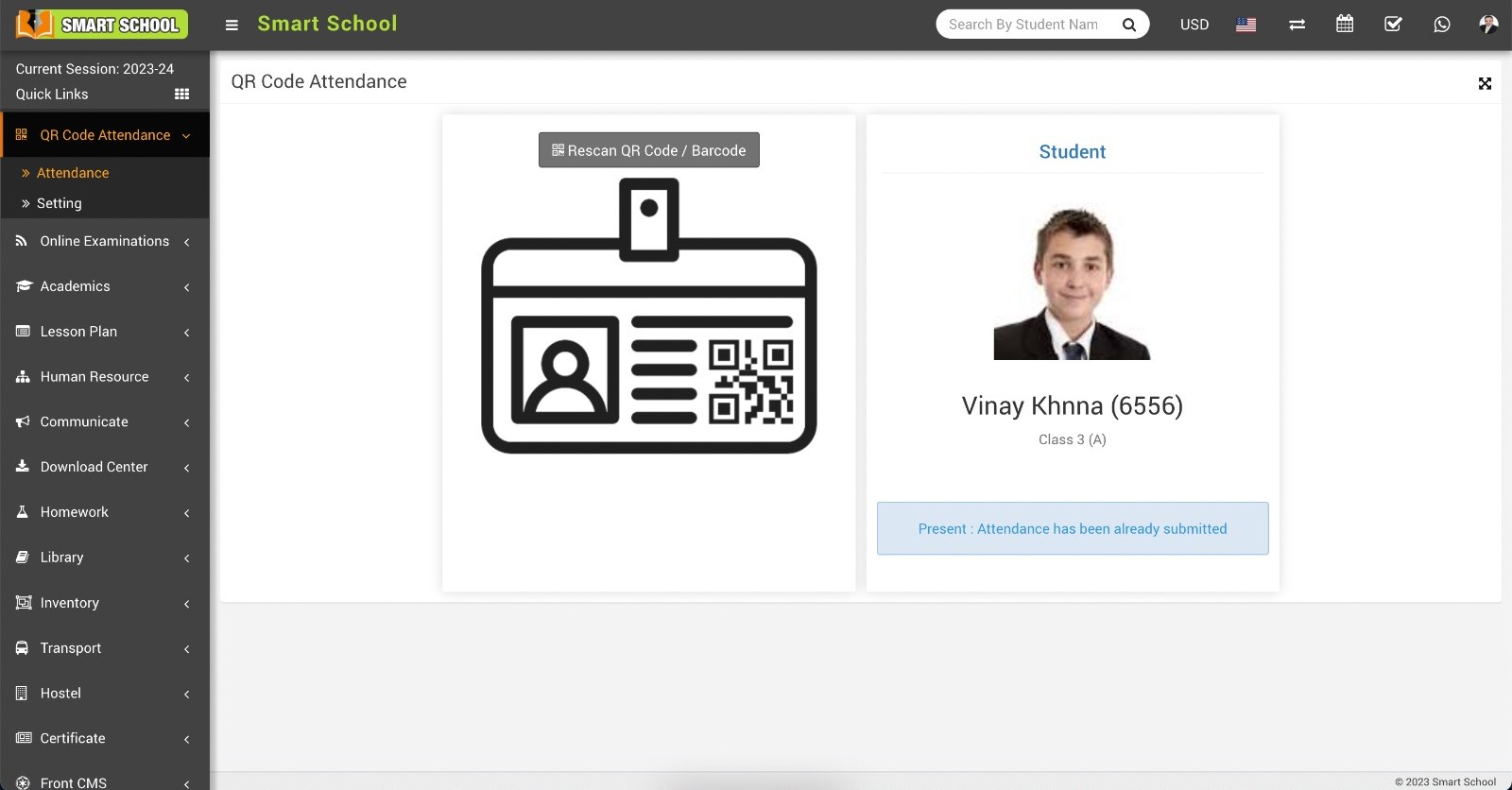If you wish to rescan the same ID card for a student or staff member, click on the Rescan QR Code / Barcode button located at the top. The scanner will open, proceed to scan the ID card. This time, a message will be displayed that attendance has been already submitted as Present, Late, or Half Day, reflecting the previous marking.