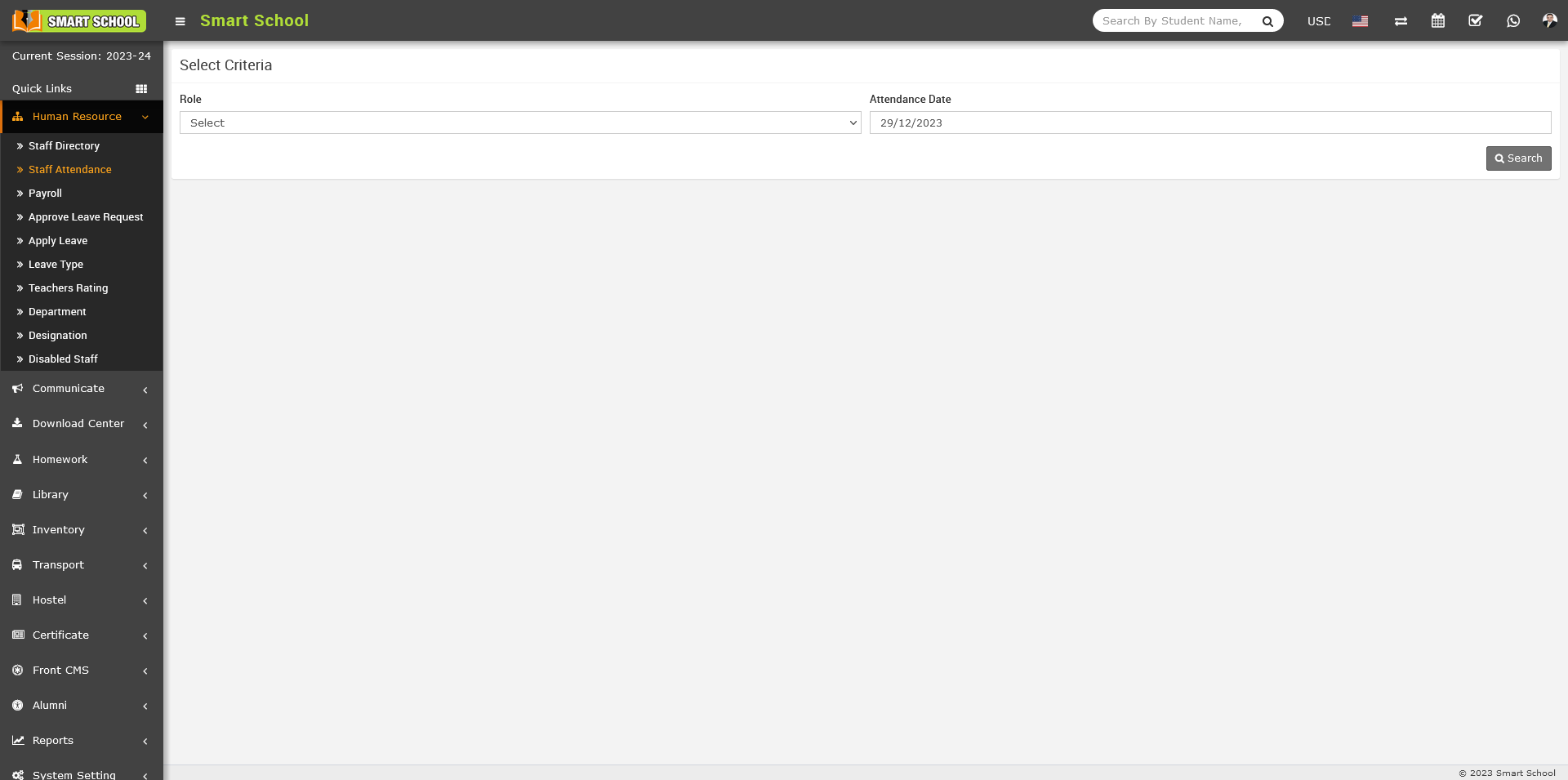 Here search the role of the staff and select the attendance date then click on the search button the attendance will be display below.