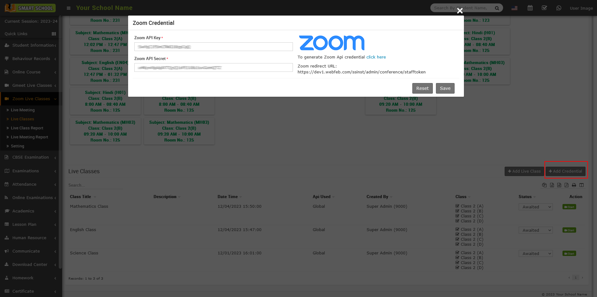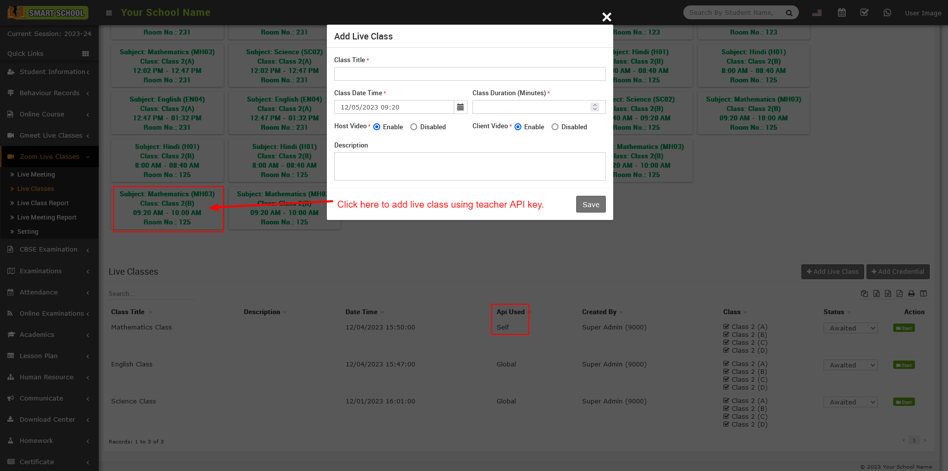 Note- To create Zoom Live Class using Teacher api key credential, please note that it must be created from Timetable otherwise if Live class created from Add Class button so it will always use global api key.