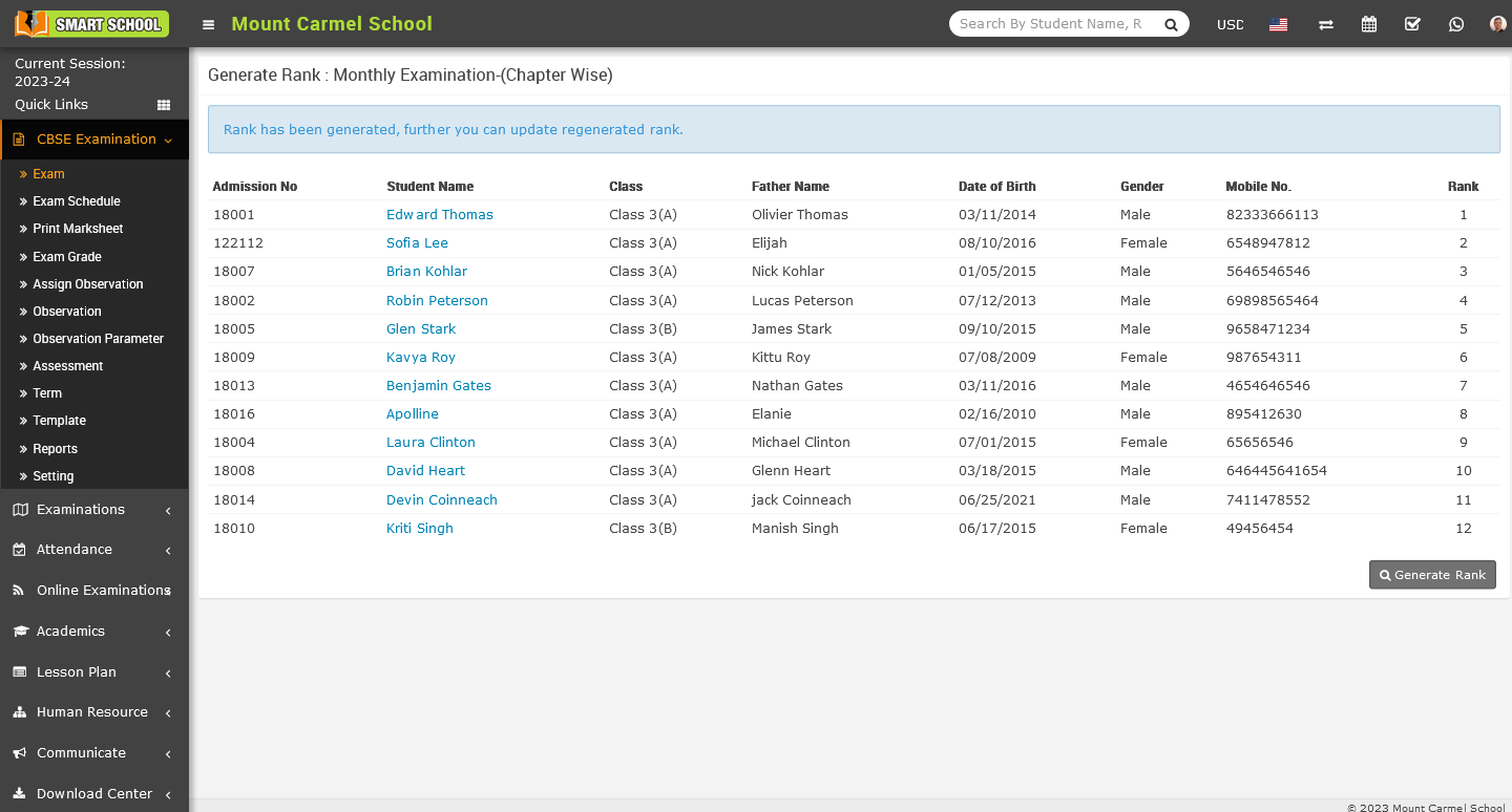 Now click on Generate Rank icon, Generate Rank page will be open. On this page, you can view the list of student details, including the student's admission number, student name, class, and father’s name, date of birth, gender, mobile number, and rank. Initially, the rank column will be blank until you generate the rank.