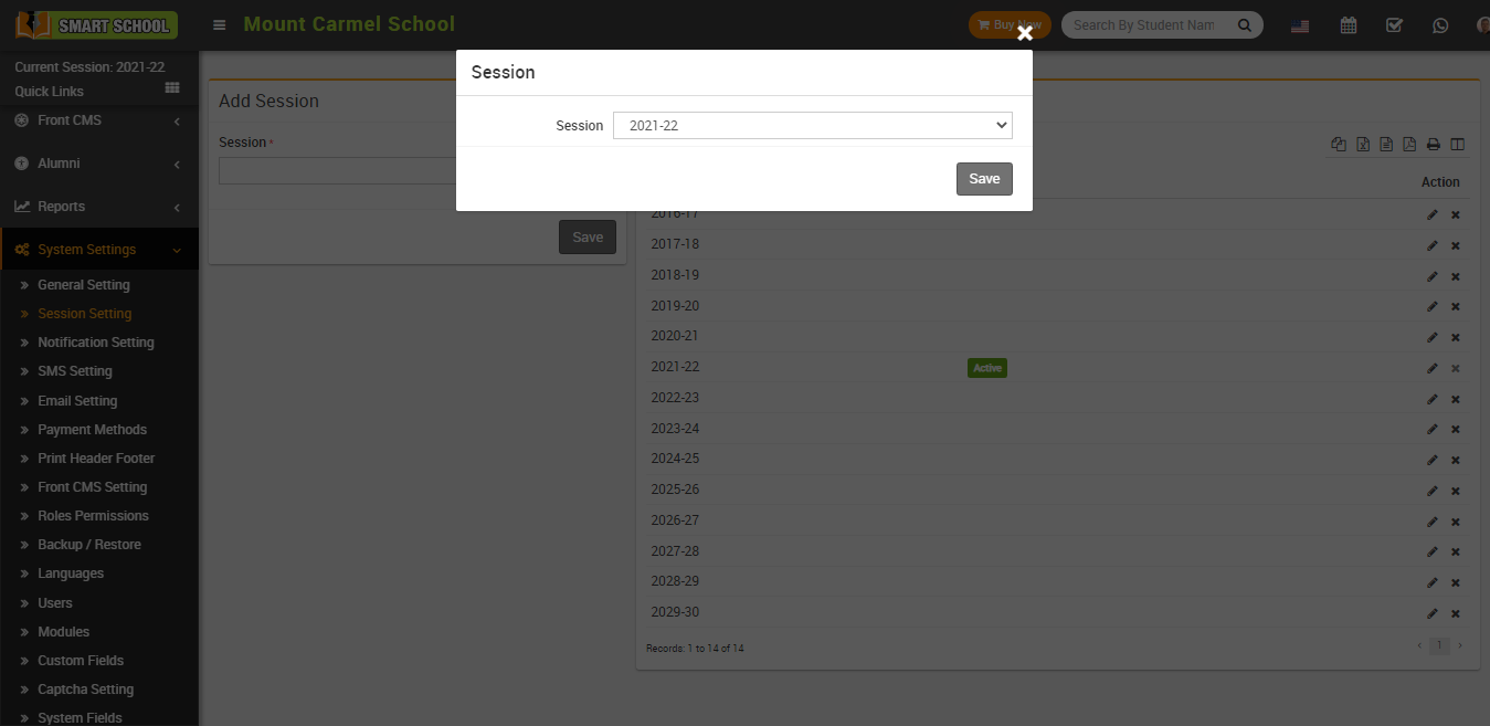 To manage school academics session you can add session from System Settings > Session Setting here enter Session and then click on Save button. You can view this added record in the Session List on the right side of the page.
