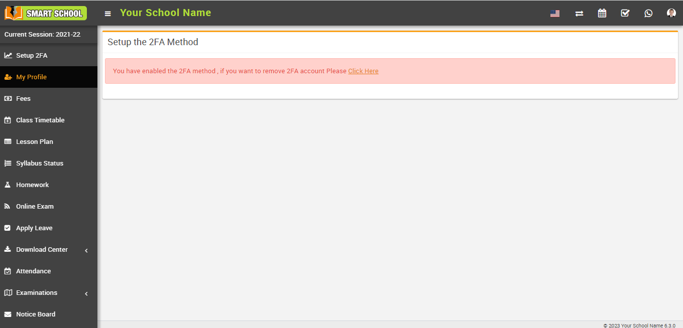 Now, open the Smart School user login, navigate to the User Profile Image in the top right corner, and then click on Settings. The Setup 2FA page will now open; please fill in the six-digit verification code that receive on your mobile device in the left column, below the QR code, and click on Verify & Activate.