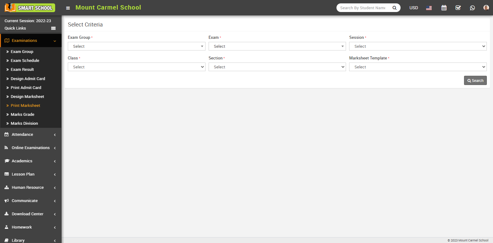 Now select the Exam Group, Exam, Session and Class, Section and Marksheet Template and click on the Search button. The Student List will be displayed below.