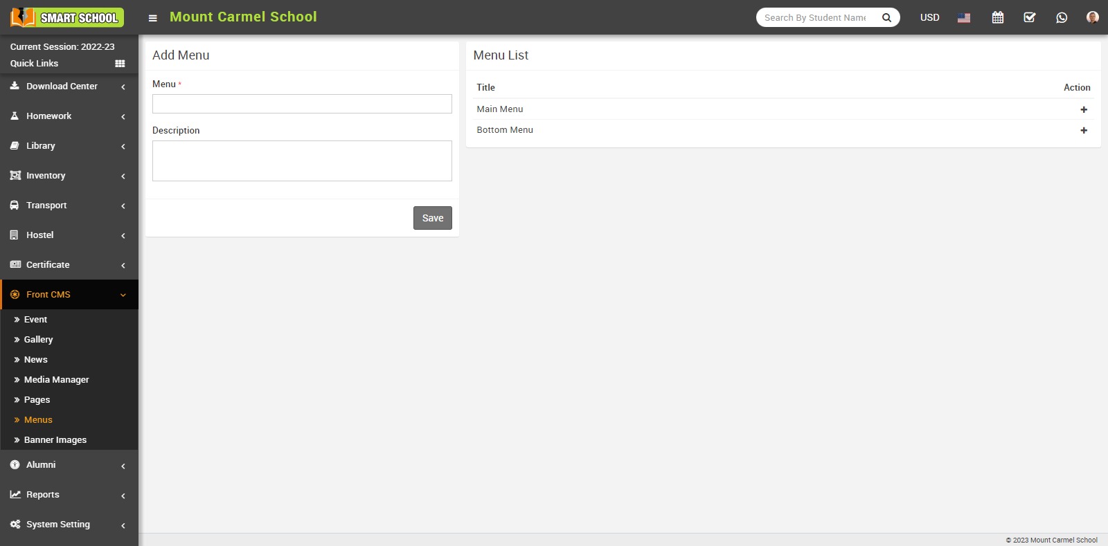 To show CBSE Exam Result on the front site, first you need to create the CBSE Exam Result tab on the front site, for this simply go to Front CMS > Menus.