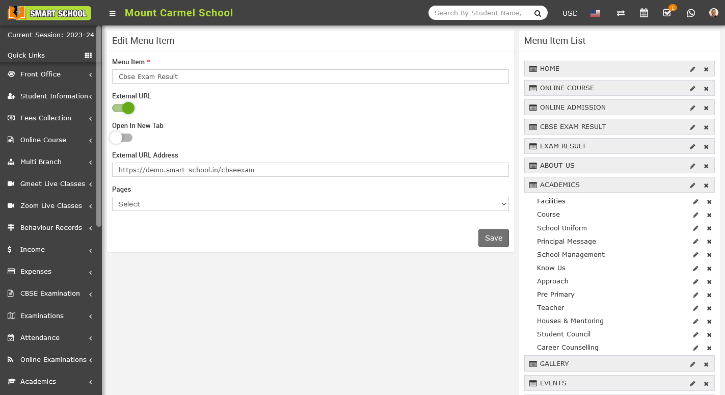 For Example:- In Menu Item enter CBSE Exam result, enable External URL toggle button, disable Open in New Tab, enter External URL Address, Pages drop down don’t select any dropdown then click on the save button.