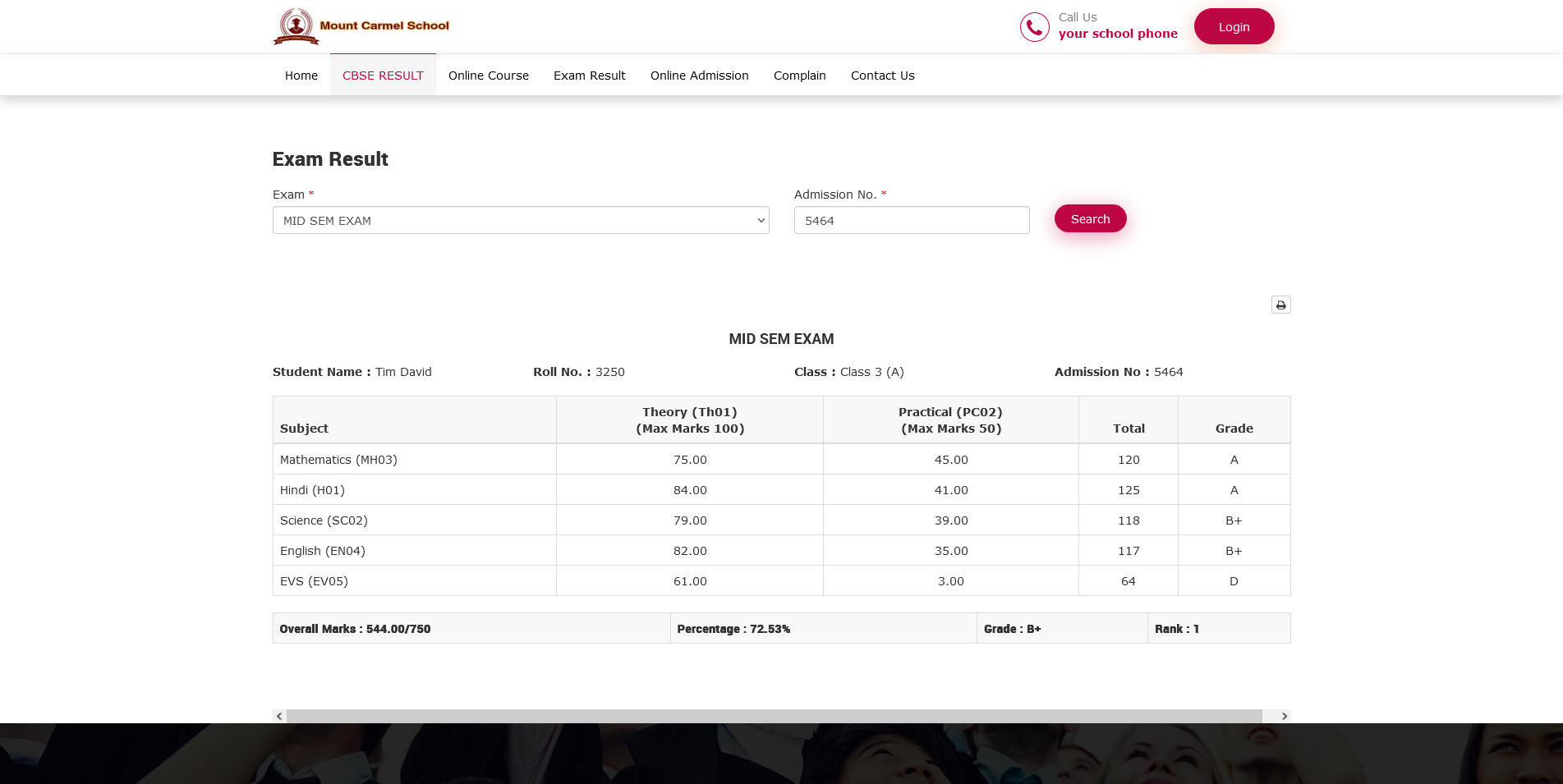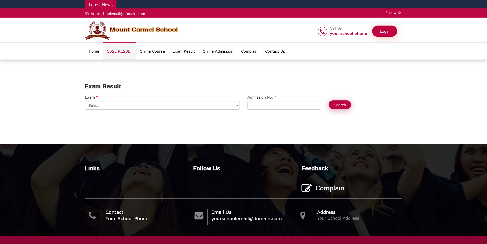 You can view CBSE Exam Result on your Smart School's front site. In this module you can see Exam tab drop down and Admission No. tab drop down available.