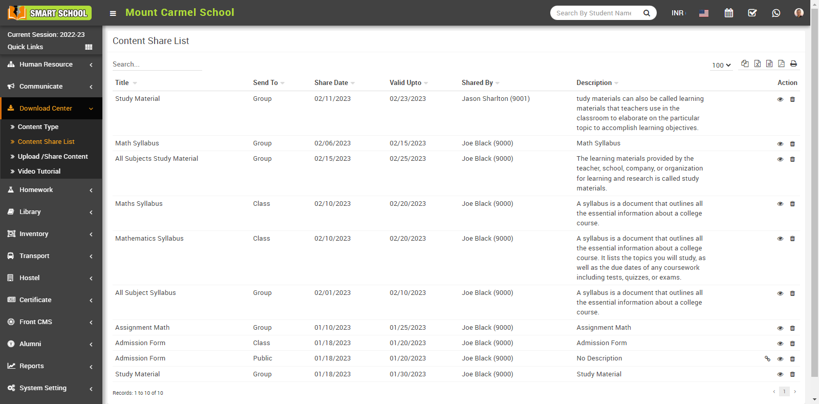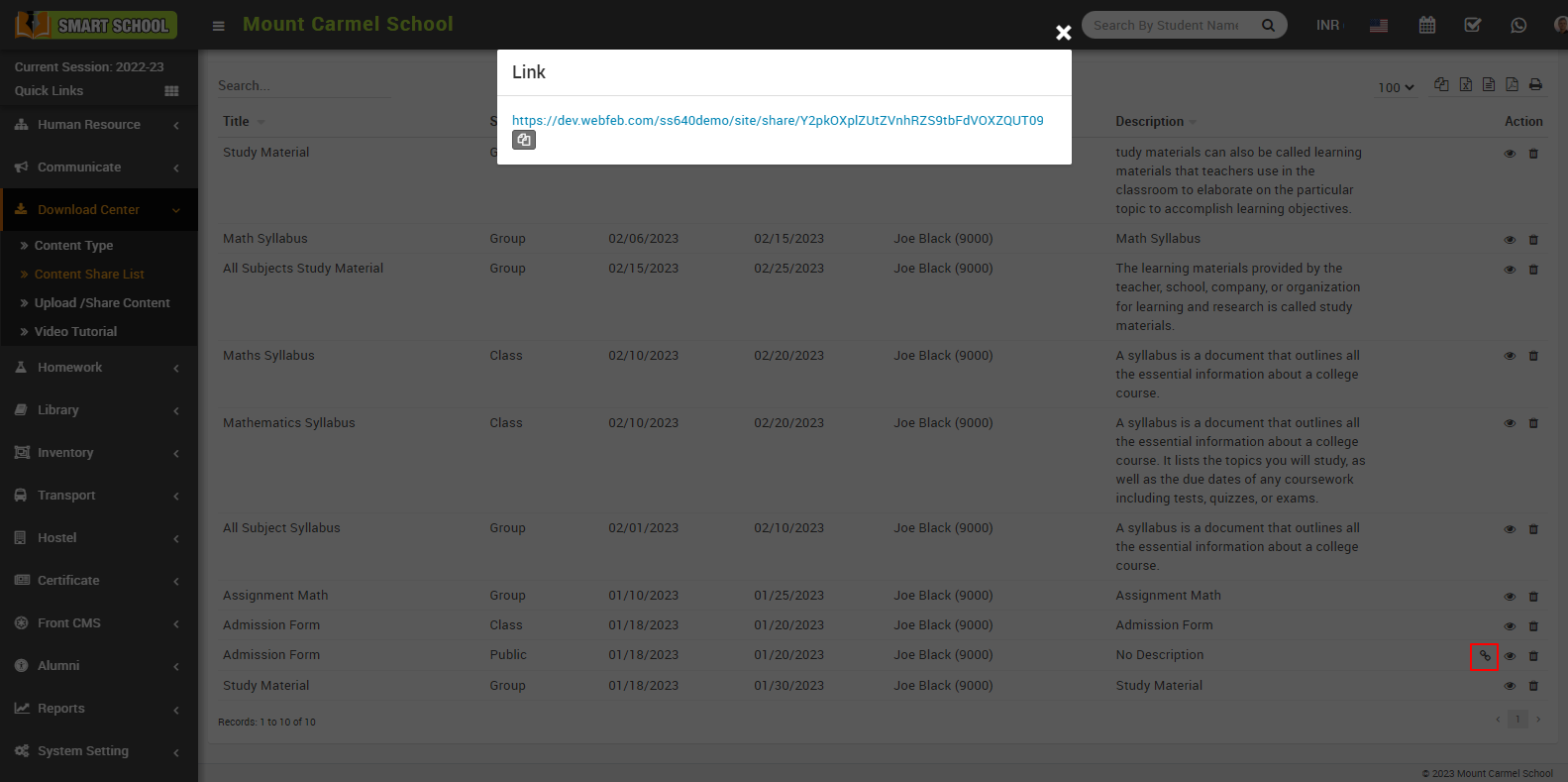 To view the content share list, go to Download Centre > Content Share List. Content share list will be open, in this list you can see the content details as Title, Send to, Share Date, Valid Upto, Shared By, and Description of content. In the action column, here link, view and delete option available.