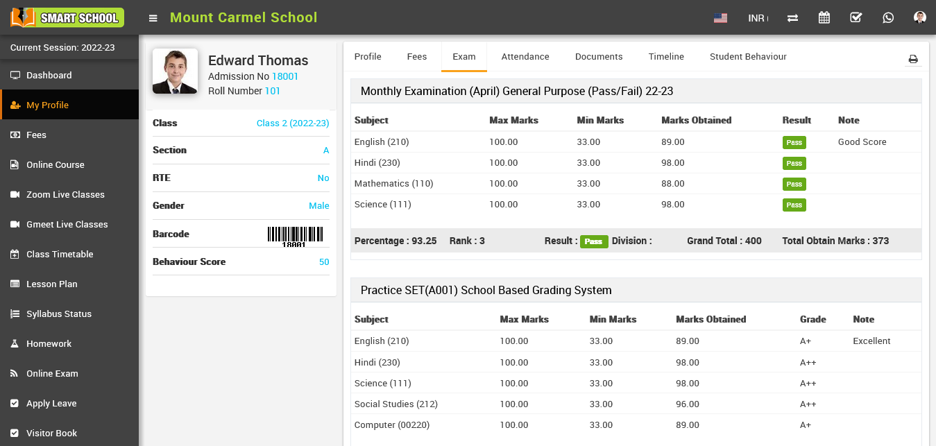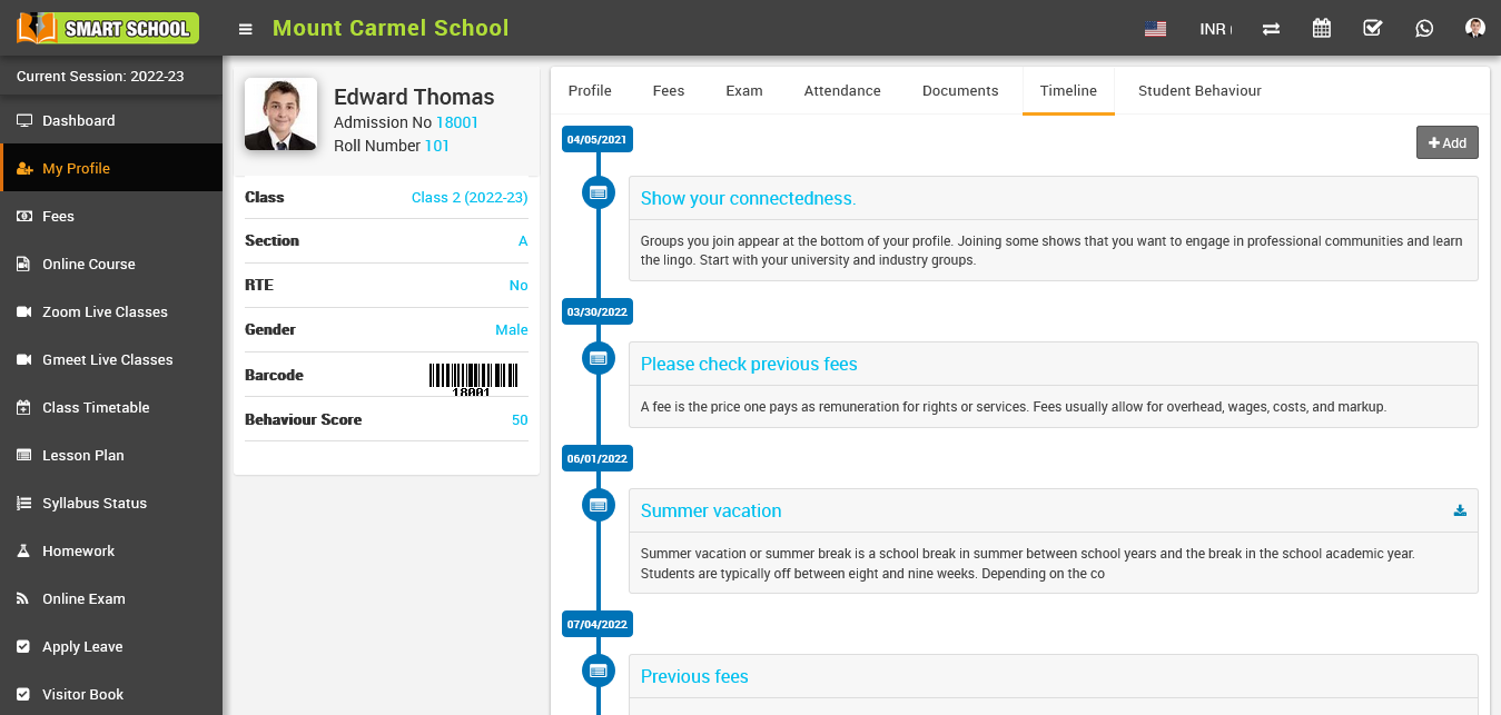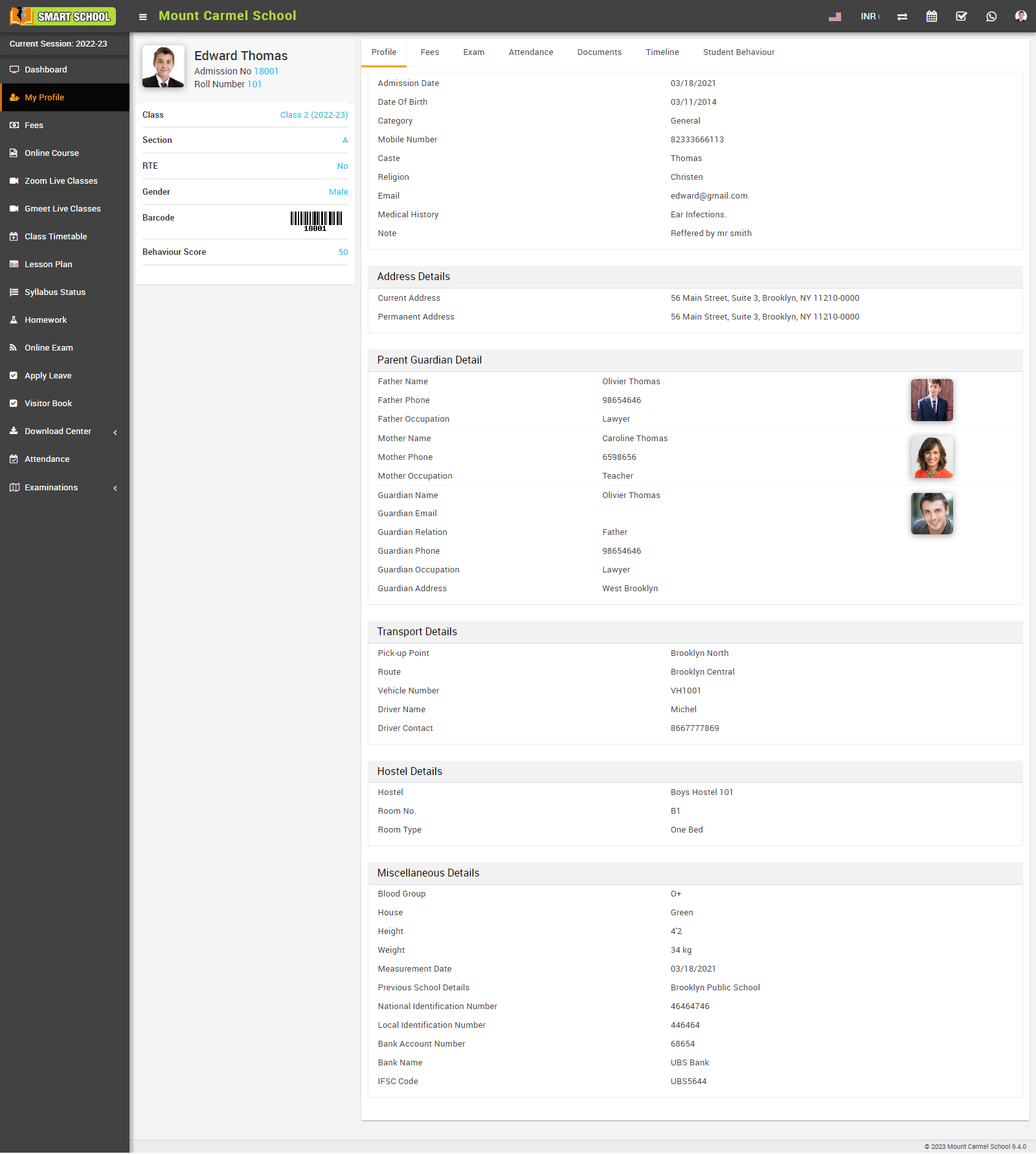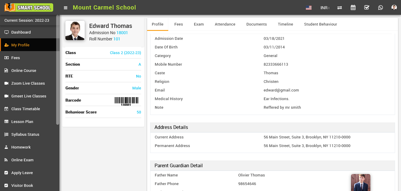 Profile: In the Profile section, you can view all the relevant details of the student.