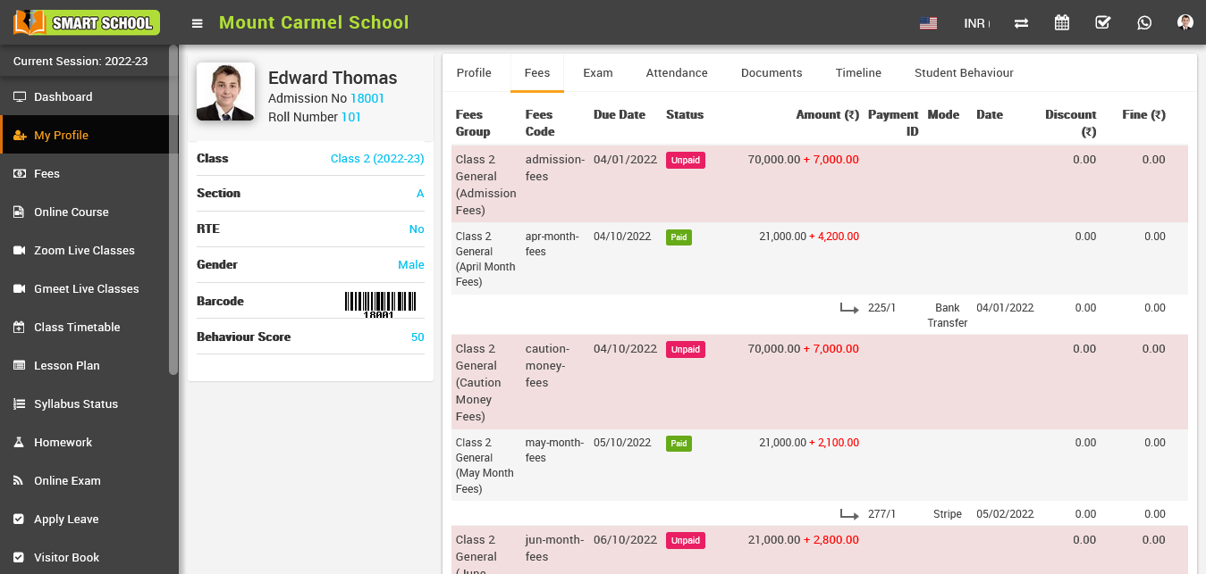 Fees: In the Fees section, you can view the student's fees including transport fees, and their payment status which can be paid, unpaid, or partial.