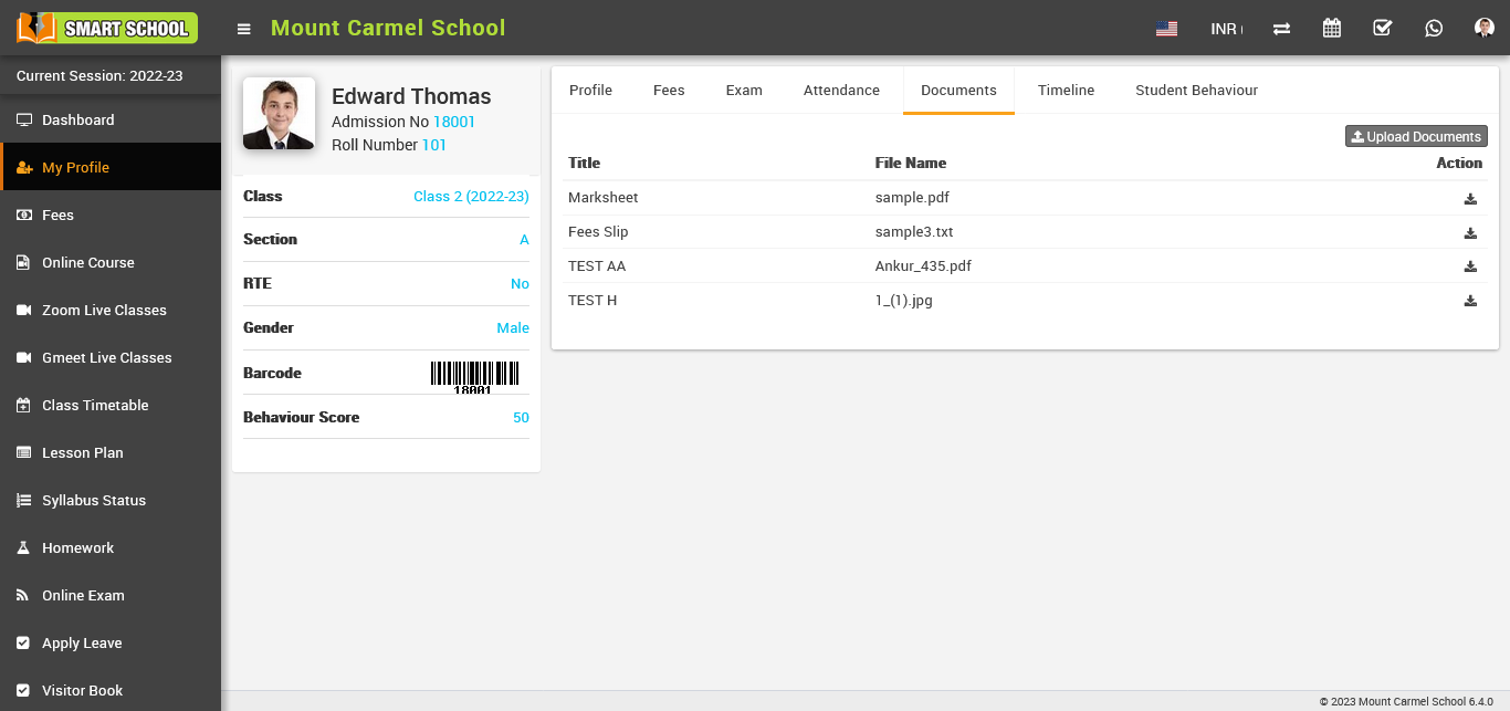 Documents: In the Documents section, you can view the documents uploaded by the superadmin and the documents uploaded by the student.