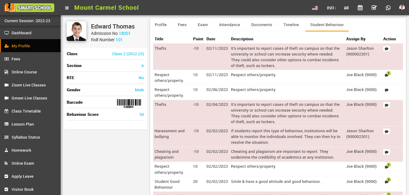 Student Behaviour: In the Student Behaviour section, you can view the assigned incidents.