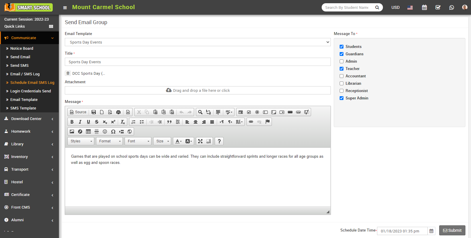 To view the Schedule Email SMS Log, go to Communicate > Schedule Email SMS Log; here you can view the entire Schedule Email SMS Log.