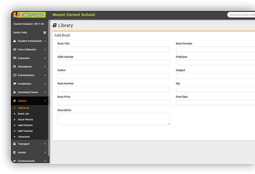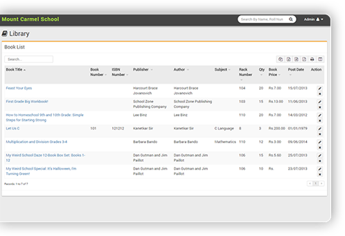 Manage books with complete books inventory including details like ISBN, author, publisher, rack number, quantity, price, postdate etc