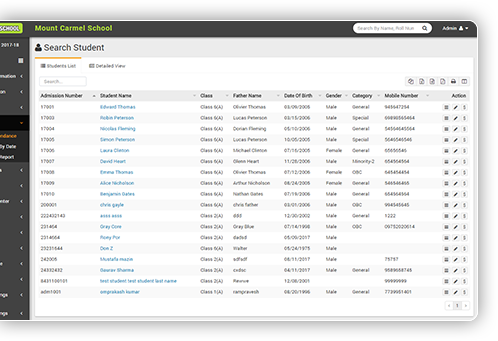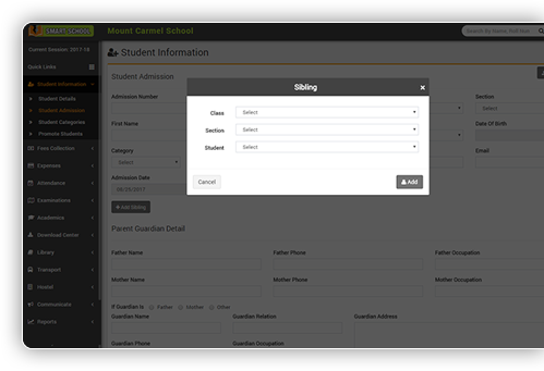 Powerful student admission form add 40+ records for student including previous school details. Add student siblings, RTE, IDs and multipledocuments to maintain complete record in student profile